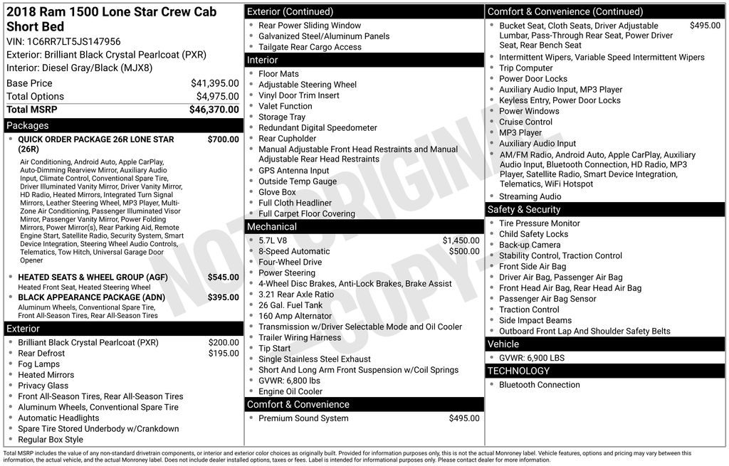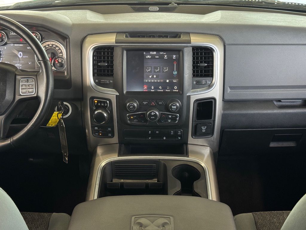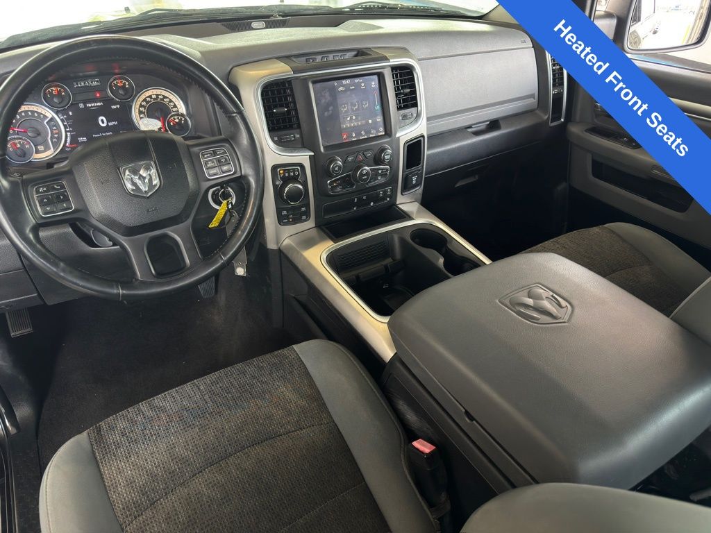 Alloy wheels, AM/FM radio: SiriusXM, Apple CarPlay, Audio Jack Input for Mobile Devices, Auto-Dimming Exterior Mirrors, Auto-Dimming Rear-View Mirror, Black Appearance Package, Black Exterior Mirrors, Black Headlamp Bezels, Black Painted Honeycomb Grille, Black Ram Head Tailgate Badge, Body Color Door Handles, Brake assist, Bright/Bright Billets Grille, Bumpers: chrome, Center Hub, Charge Only Remote USB Port, Class IV Receiver Hitch (DISC), Compass, Delay-off headlights, Driver door bin, Dual front impact airbags, Dual front side impact airbags, Dual Rear Exhaust w/Bright Tips, Electric Shift-On-Demand Transfer Case, Electroluminescent Instrument Cluster, Electronic Shift, Electronic Stability Control, Exterior Mirrors Courtesy Lamps, Exterior Mirrors w/Heating Element, Exterior Mirrors w/Supplemental Signals, Flat Black Ram 1500 Badge, Folding Flat Load Floor Storage, Front anti-roll bar, Front Armrest w/3 Cupholders, Front Center Armrest w/Storage, Front Center Seat Cushion Storage, Front Fog Lamps, Front reading lights, Front wheel independent suspension, Fully automatic headlights, Glove Box Lamp, Google Android Auto, GPS Antenna Input, HD Radio, Heated door mirrors, Heated Seats & Wheel Group, Heated Steering Wheel, Humidity Sensor, Illuminated entry, Integrated Voice Command w/Bluetooth, Leather Wrapped Steering Wheel, LED Bed Lighting, Lone Star Badge, Lone Star Regional Package, Low tire pressure warning, Media Hub (2 USB, AUX), Occupant sensing airbag, Outside temperature display, Overhead airbag, Overhead console, Overhead Console w/Garage Door Opener, Painted Front Bumper, Painted Rear Bumper, Panic alarm, ParkSense Rear Park Assist System, ParkView Rear Back-Up Camera, Passenger door bin, Passenger vanity mirror, Power door mirrors, Power Heated Fold-Away Mirrors, Power Lumbar Adjust, Power steering, Power windows, Power-Folding Mirrors, Premium Cloth 40/20/40 Bench Seat, Quick Order Package 26R Lone Star (Regional) (DISC), Radio data system, Radio: Uconnect 4C w/8.4" Display, Rear 60/40 Split Folding Seat, Rear anti-roll bar, Rear Dome w/On/Off Switch Lamp, Rear seat center armrest, Rear step bumper, Rear Window Defroster, Remote keyless entry, Remote USB Port, Security Alarm, Semi-Gloss Black Hub, SiriusXM Satellite Radio, Speed control, Steering Wheel Mounted Audio Controls, Storage Tray, Sun Visors w/Illuminated Vanity Mirrors, Tachometer, Tilt steering wheel, Tip Start, Traction control, Trip computer, Universal Garage Door Opener, USB Host Flip, Variably intermittent wipers, Voltmeter, Wheels: 20" x 8" Aluminum Chrome Clad, Wheels: 20" x 8" Semi-Gloss Black Aluminum (DISC), Heated Front Seats, Power 10-Way Driver Seat, Remote Start System.