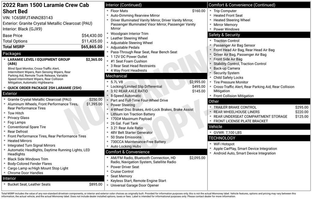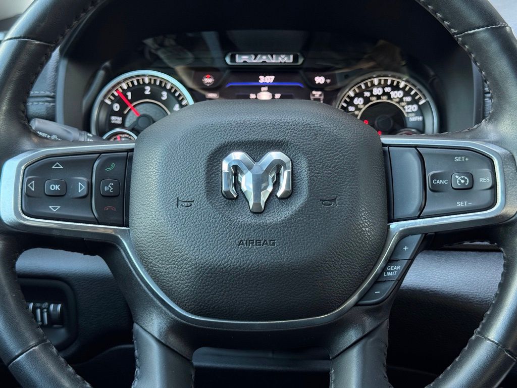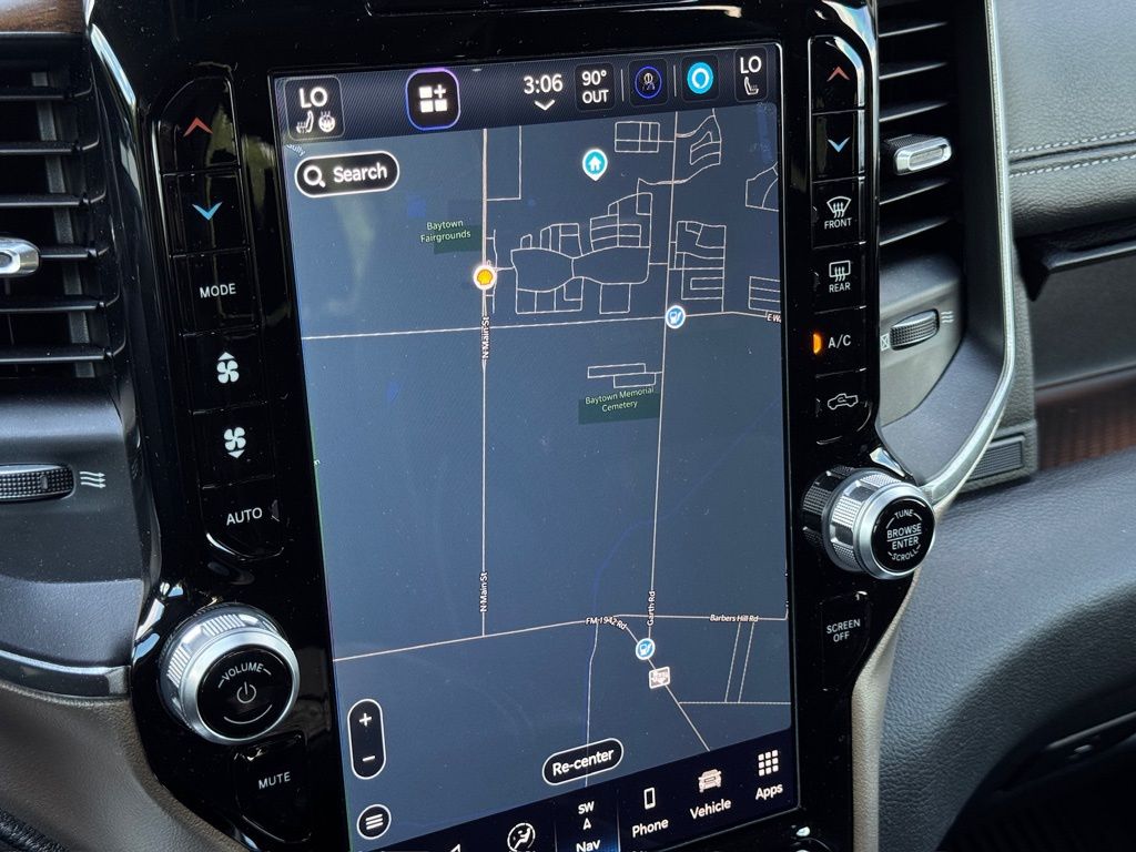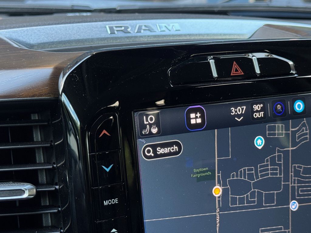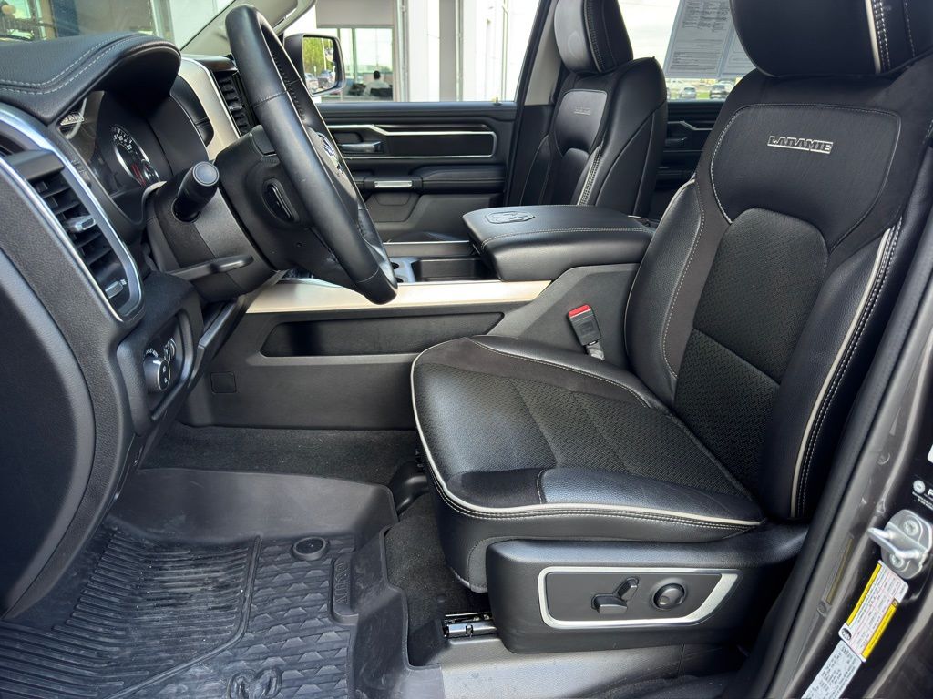 wheels, AM/FM radio: SiriusXM, Anti-Spin Differential Rear Axle, Apple CarPlay, Apple CarPlay/Android Auto, Audio memory, Auto High Beam Headlamp Control, Auto-dimming door mirrors, Auto-Dimming Exterior Driver Mirror, Auto-dimming Rear-View mirror, Automatic temperature control, Blind Spot & Cross Path Detection, Brake assist, Bumpers: chrome, Chrome Exterior Mirrors, Compass, Connected Travel & Traffic Services, Connectivity - US/Canada, Convex Wide-Angle Mirror Insert, Delay-off headlights, Disassociated Touchscreen Display, Driver door bin, Driver Seat Memory, Driver vanity mirror, Dual front impact airbags, Dual front side impact airbags, Electronic Stability Control, Exterior Mirrors Courtesy Lamps, Exterior Mirrors w/Heating Element, Exterior Mirrors w/Memory, Exterior Mirrors w/Supplemental Signals, Foam Bottle Insert (Door Trim Panel), For Details, Visit DriveUconnect.com, For More Info, Call 800-643-2112, Front anti-roll bar, Front Center Armrest w/Storage, Front dual zone A/C, Front fog lights, Front License Plate Bracket, Front reading lights, Front Seat Back Map Pockets, Front wheel independent suspension, Fully automatic headlights, Garage door transmitter, Global Telematics Box Module (TBM), Google Android Auto, GPS Antenna Input, GPS Navigation, HD Radio, Heated door mirrors, Heated Front Seats, Heated front seats, Heated Steering Wheel, Heated steering wheel, Heavy-Duty Engine Cooling, Illuminated entry, Integrated Center Stack Radio, Integrated Voice Command w/Bluetooth, Laramie Level I Equipment Group, Leather steering wheel, Leather Trim 40/20/40 Bench Seat, Low tire pressure warning, Memory seat, MOPAR Front & Rear Rubber Floor Mats, Occupant sensing airbag, Outside temperature display, Overhead airbag, Overhead console, Panic alarm, ParkSense Front/Rear Park Assist w/Stop, ParkView Rear Back-Up Camera, Passenger door bin, Passenger vanity mirror, Pedal memory, Power 2-Way Driver Lumbar Adjust, Power 2-Way Passenger Lumbar Adjust, Power 8-Way Driver & Passenger Seats, Power door mirrors, Power driver seat, Power passenger seat, Power steering, Power windows, Power-Folding Mirrors, Quick Order Package 25H Laramie, Radio data system, Radio: Uconnect 5 Nav w/12.0" Display, Radio: Uconnect 5 W w/8.4" Display, Rain Sensitive Windshield Wipers, Rear 60/40 Folding Seat, Rear anti-roll bar, Rear seat center armrest, Rear step bumper, Rear Underseat Compartment Storage (DISC), Rear Wheelhouse Liners, Rear window defroster, Remote keyless entry, Remote Tailgate Release, Security system, SiriusXM Radio Service, SiriusXM w/360L, Speed control, Split folding rear seat, Steering wheel mounted audio controls, Tachometer, Telescoping steering wheel, Tilt steering wheel, Traction control, Trailer Brake Control, Trip computer, Turn signal indicator mirrors, USB Host Flip, Variably intermittent wipers, Ventilated front seats, Voltmeter, Wheels: 18" x 8" Aluminum Base Painted, Wheels: 20" x 9" Premium Paint/Polished, **NAVIGATION**, APPLE CARPLAY, Ventilated Front Seats.