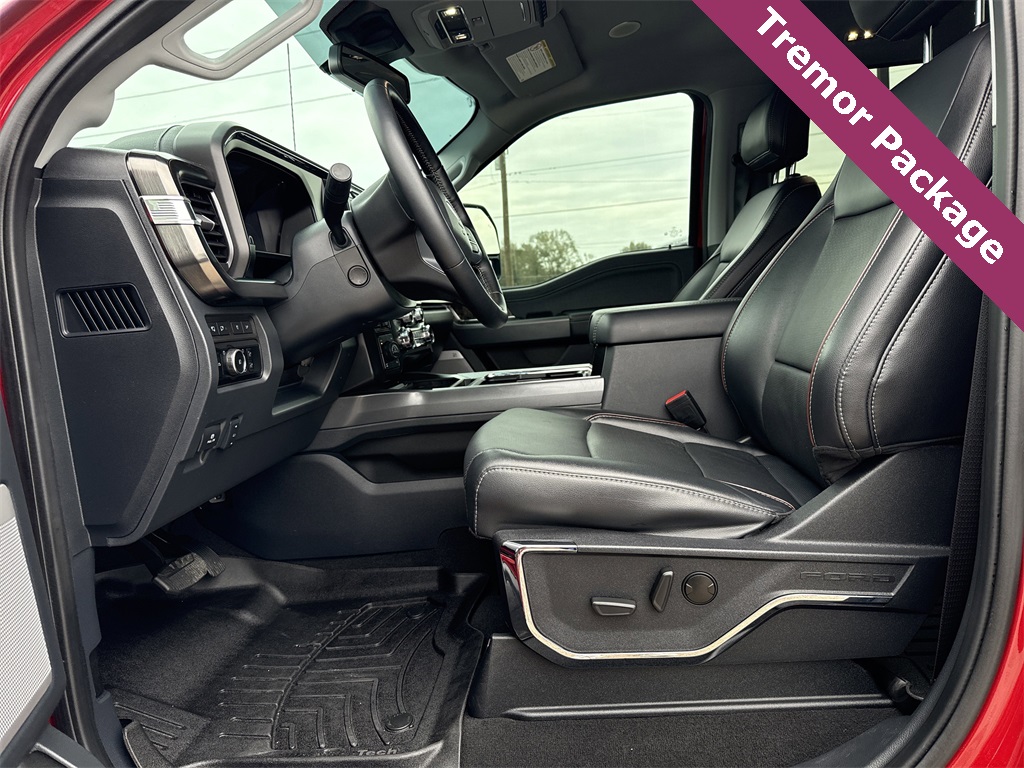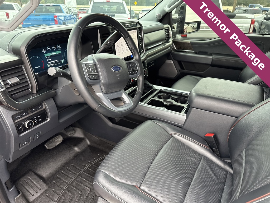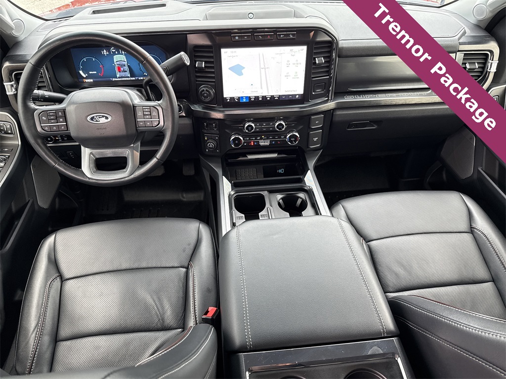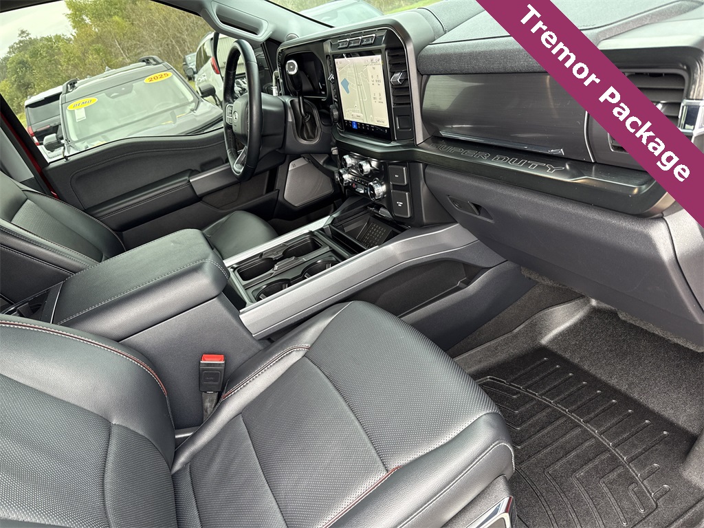 Black Appearance Package (6" Ebony Black Angular Running Boards, Body Color Front & Rear Bumpers, Ebony Black Painted Front Grille Bars, Ebony Black Painted Mirror Caps, Rear Wheel Well Liners (Pre-Installed), Tough Bed Spray-In Bedliner, and Wheels: 20" Machined & Ebony Black High Gloss), F-250 >10K GVWR Package, High Capacity 11.6" Axle Upgrade Package, Lariat Ultimate Package (4-Way Adjustable Headrests, Front Sensing System, Head-Up Display, Intelligent Adaptive Cruise Control w/Stop-and-Go, Pro Trailer Backup Assist, Pro Trailer Hitch Assist, Radio: B&O Unleashed Sound System by Bang & Olufsen, SiriusXM Radio w/360L, SYNC 4 w/Enhanced Voice Recognition, Tailgate Step & Handle, Upfitter Switches (6), and Wireless Charging Pad), Order Code 608A, 4WD, 8 Speakers, Air Conditioning, AM/FM radio: SiriusXM with 360L, Automatic temperature control, Bumpers: chrome, Front dual zone A/C, Memory seat, Navigation system: Connected Navigation (includes complimentary 1-year trial), Pedal memory, Power door mirrors, Power driver seat, Power steering, Power-Deployable Running Boards, Pro Power Onboard - 2kW, Radio: B&O Sound System by Bang & Olufsen, Rear window defroster, Remote keyless entry, Steering wheel memory, Steering wheel mounted audio controls, 4-Wheel Disc Brakes, ABS brakes, Adjustable pedals, Alloy wheels, Auto High-beam Headlights, Auto tilt-away steering wheel, Auto-dimming Rear-View mirror, Brake assist, Compass, Delay-off headlights, Driver door bin, Driver vanity mirror, Dual 68 AH/65 AGM Batteries, Dual front impact airbags, Dual front side impact airbags, Electronic Stability Control, Emergency communication system: SYNC 4 911 Assist, Engine Block Heater, Exterior Parking Camera Rear, Flow-Through Console, Front anti-roll bar, Front Bucket Seats, Front Center Armrest, Front fog lights, Front Leather-Trimmed 40/Console/40 Seats, Front reading lights, Fully automatic headlights, Garage door transmitter, Heated door mirrors, Heated front seats, Heated rear seats, Heated steering wheel, Illuminated entry, Leather steering wheel, Low tire pressure warning, Outside temperature display, Overhead airbag, Overhead console, Panic alarm, Passenger door bin, Passenger vanity mirror, Power passenger seat, Power windows, Rain sensing wipers, Rear reading lights, Rear seat center armrest, Rear step bumper, Security system, Speed control, Split folding rear seat, Tachometer, Telescopi
