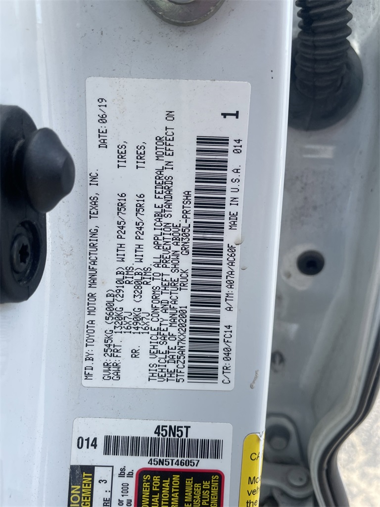 front head restraints, Auto High-beam Headlights, Auto-dimming Rear-View mirror, Axle Ratio: 3.91, Brake assist, Bumpers: body-color, CD player, Chrome Rear Bumper, Color-Keyed Overfenders, Daytime Running Lamps, Driver door bin, Dual front impact airbags, Dual front side impact airbags, Exterior Parking Camera Rear, Fabric Seat Trim (FC), Front anti-roll bar, Front Bucket Seats, Front Center Armrest, Front Fog Lamps, Front fog lights, Front reading lights, Front wheel independent suspension, Knee airbag, Occupant sensing airbag, Outside temperature display, Overhead airbag, Overhead console, Panic alarm, Passenger door bin, Power door mirrors, Power Sliding Rear Window w/Privacy Glass, Power steering, Power windows, Radio: Entune Plus AM/FM/CD w/HD Radio, Rear step bumper, Remote Keyless Entry System, Speed control, Speed-sensing steering, Split folding rear seat, Steering wheel mounted audio controls, Tachometer, Telescoping steering wheel, Tilt steering wheel, Trip computer, Variable Intermittent Wipers, and Variably intermittent wipers.