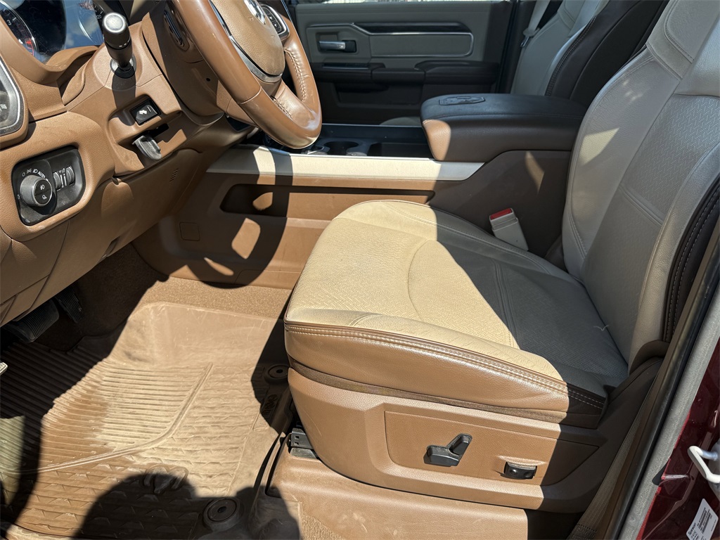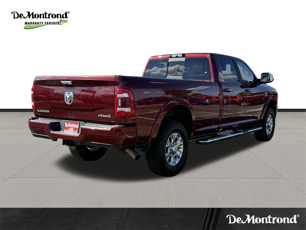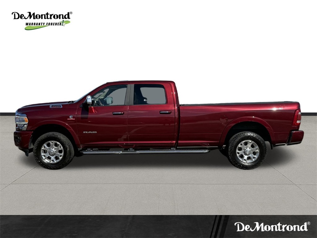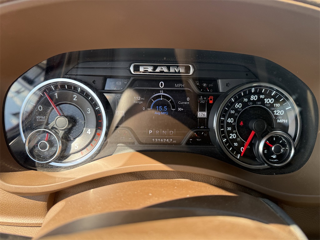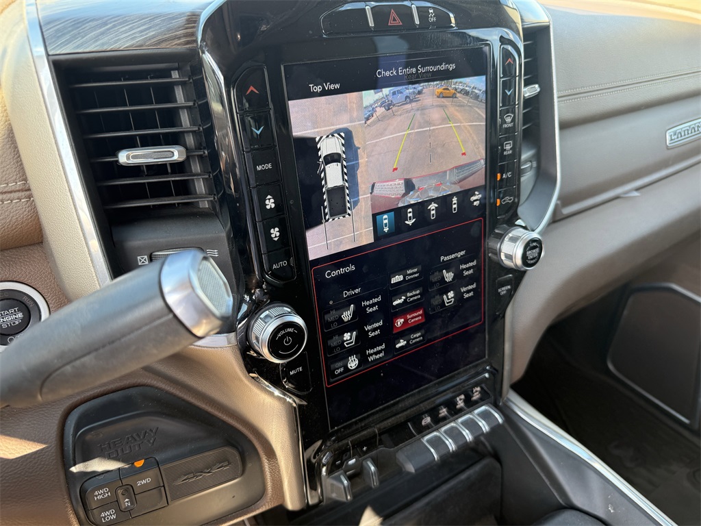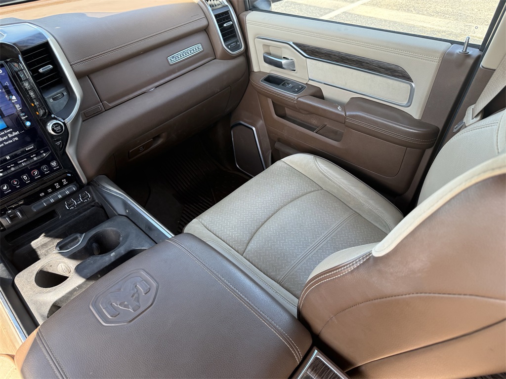 vel Link Service, 8.4" Touchscreen Display, Apple CarPlay, Auto High Beam Headlamp Control, Blind Spot & Cross Path Detection, Disassociated Touchscreen Display, Exterior Mirrors w/Memory, Foam Bottle Insert (Door Trim Panel), For Details Visit DriveUconnect.com, Google Android Auto, GPS Antenna Input, GPS Navigation, HD Radio, Heated Second Row Seats, Integrated Center Stack Radio, Integrated Voice Command w/Bluetooth, Media Hub w/2 Charge Only USBs, Mirror-Mounted Aux Reverse Lamps, Power Adjustable Convex Aux Mirrors, Power Adjustable Pedals w/Memory, Power Chrome Tow Mirrors w/Convex Spotter & Memory, Radio: Uconnect 4C Nav w/8.4" Display, Radio/Driver Seat/Mirrors/Pedals Memory, Rain Sensitive Windshield Wipers, Remote Tailgate Release, SiriusXM Satellite Radio, SiriusXM Traffic Plus, SiriusXM Travel Link, USB Host Flip, and Ventilated Front Seats), Quick Order Package 21H Laramie, Towing Technology Group (CTR Stop Lamp w/Cargo View Camera, Surround View Camera System, and Trailer Reverse Guidance), #1 Seat Foam Cushion, 10 Speakers, 115V Auxiliary Rear Power Outlet, 12" Touchscreen Display, 2 Way Rear Headrest Seat, 220 Amp Alternator, 3.73 Axle Ratio, 4 Way Front Headrests, 4-Wheel Disc Brakes, 50 Gallon Fuel Tank, 5th Wheel/Gooseneck Towing Prep Group, ABS brakes, Active Noise Control System, Adjustable pedals, Air Conditioning, Alloy wheels, AM/FM radio: SiriusXM, Apple CarPlay/Android Auto, Auto-dimming Rear-View mirror, Automatic temperature control, Brake assist, Bumpers: chrome, Center Hub, Chrome Flat Wheel-to-Wheel Side Steps, Clearance Lamps, Compass, Delay-off headlights, Driver door bin, Driver vanity mirror, Dual front impact airbags, Dual front side impact airbags, Electronic Stability Control, Electronically Controlled Throttle, Folding Flat Load Floor Storage, Front & Rear Rubber Floor Mats, Front anti-roll bar, Front Bumper Sight Shields, Front Center Armrest w/Storage, Front dual zone A/C, Front fog lights, Front reading lights, Front Seat Back Map Pockets, Fully automatic headlights, Garage door transmitter, Heated door mirrors, Heated Front Seats, Heated front seats, Heated Steering Wheel, Heated steering wheel, High Back Seats, Illuminated entry, Leather steering wheel, Leather Trim 40/20/40 Bench Seat, LED Bed Lighting, Low tire pressure warning, Occupant sensing airbag, Outside temperature display, Overhead airbag, Overhead console, Panic alarm, ParkView Rear Back-Up Camera, Passenger door bin, Passenger vanity mirror, Power 8-Way Adjustable Passenger Seat, Power Adjust 8-Way Driver Seat, Power door mirrors, Power driver seat, Power passenger seat, Power steering, Power windows, Radio data system, Radio: Uconnect 12.0 w/Navigation, Radio: Uconnect 4 w/8.4" Display, Rear 60/40 Folding Seat, Rear reading lights, Rear seat center armrest, Rear step bumper, Rear Wheelhouse Liners, Rear window defroster, Remote keyless entry, Security system, SiriusXM w/360L, Speed control, Split folding rear seat, Spray In Bedliner, Steering wheel mounted audio controls, Tachometer, Tilt steering wheel, Tip Start, Traction control, Trip computer, Turn signal indicator mirrors, Variably intermittent wipers, Voltmeter, and Wheels: 18" x 8.0" Polished AluminuM.