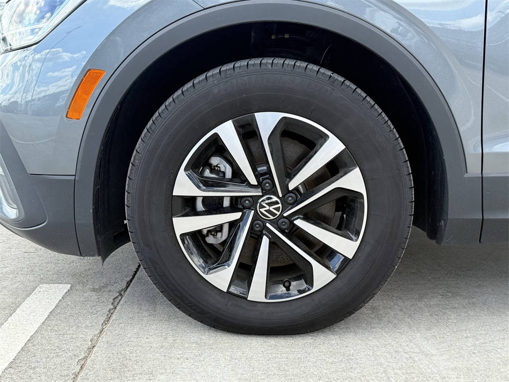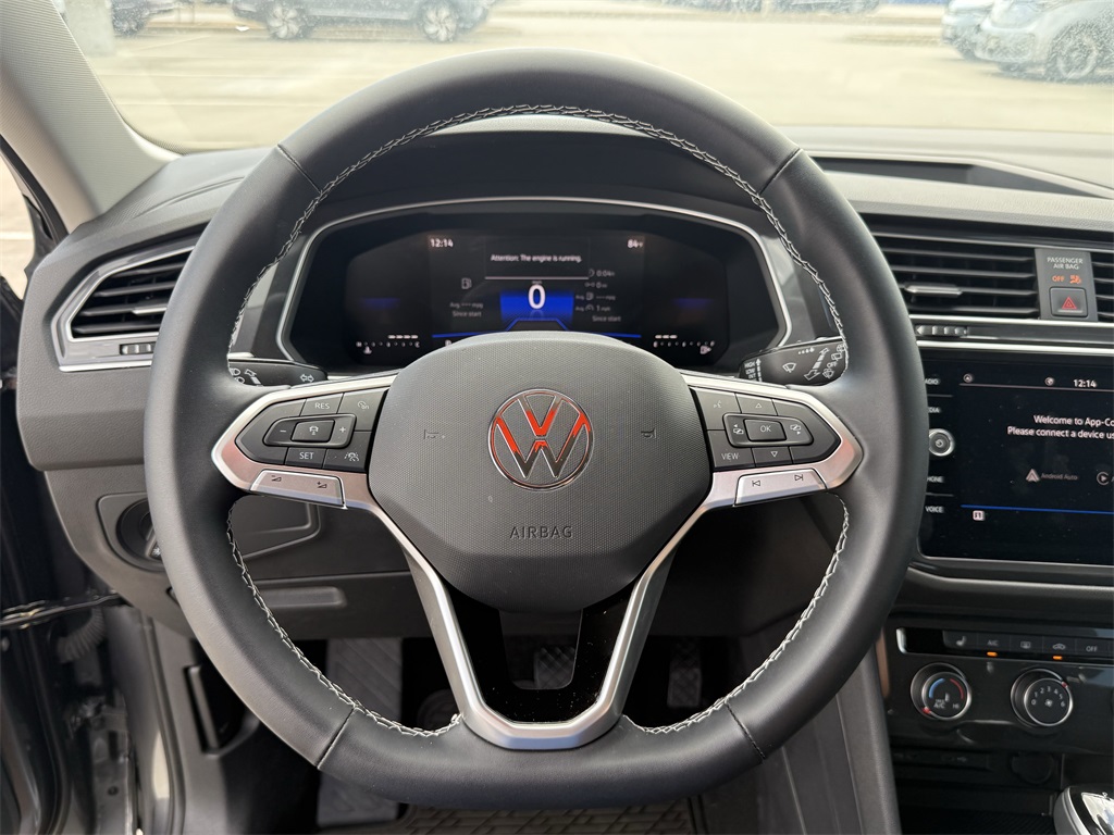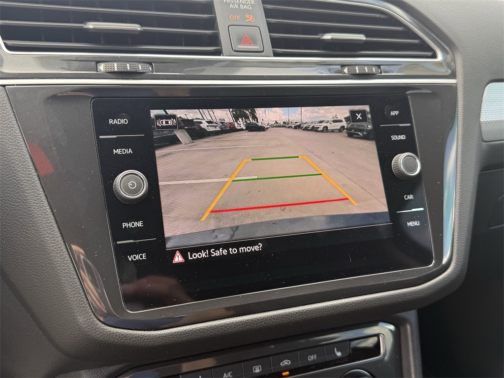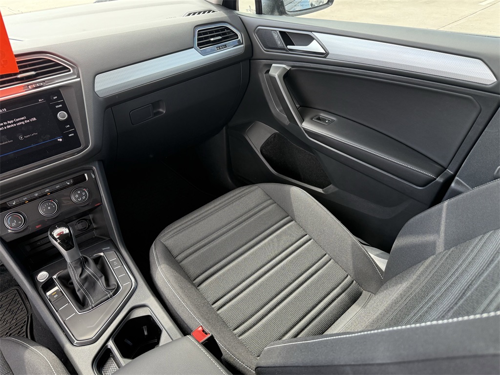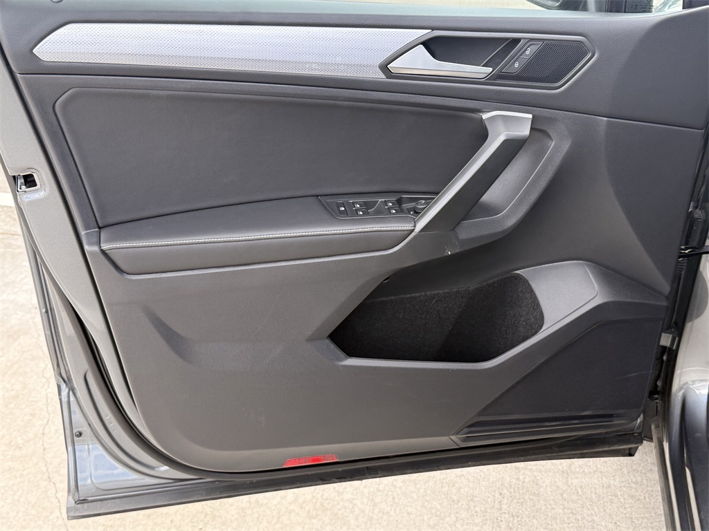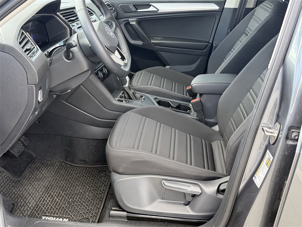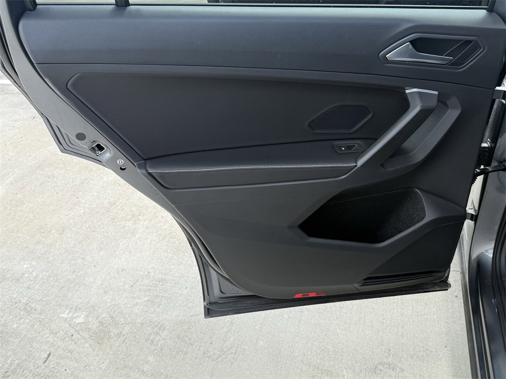 ake assist, Bumpers: body-color, Compass, Delay-off headlights, Driver door bin, Driver vanity mirror, Dual front impact airbags, Dual front side impact airbags, Electronic Stability Control, Emergency communication system: VW Car-Net Safe & Secure 5-year, Exterior Parking Camera Rear, Four wheel independent suspension, Front anti-roll bar, Front Bucket Seats, Front Center Armrest, Front dual zone A/C, Front reading lights, Fully automatic headlights, Heated door mirrors, Heated Front Seats, Heated front seats, Illuminated entry, Leather Shift Knob, Leather steering wheel, Low tire pressure warning, Occupant sensing airbag, Outside temperature display, Overhead airbag, Overhead console, Panic alarm, Passenger door bin, Passenger vanity mirror, Perforated V-Tex Leatherette Seating Surfaces, Power door mirrors, Power driver seat, Power Liftgate, Power moonroof, Power steering, Power windows, Radio data system, Radio: MIB3 Composition Media AM/FM/HD, Rain sensing wipers, Rear anti-roll bar, Rear reading lights, Rear seat center armrest, Rear window defroster, Rear window wiper, Remote keyless entry, Security system, Speed control, Speed-sensing steering, Split folding rear seat, Spoiler, Sport steering wheel, Steering wheel mounted audio controls, Tachometer, Telescoping steering wheel, Tilt steering wheel, Traction control, Trip computer, Turn signal indicator mirrors, Variably intermittent wipers, and Wheels: 19" Black Painted Twin 5-Spoke Alloy. 2024 Volkswagen Tiguan 2.0T SE R-Line Black 4D Sport Utility Gray 23/30 City/Highway MPG