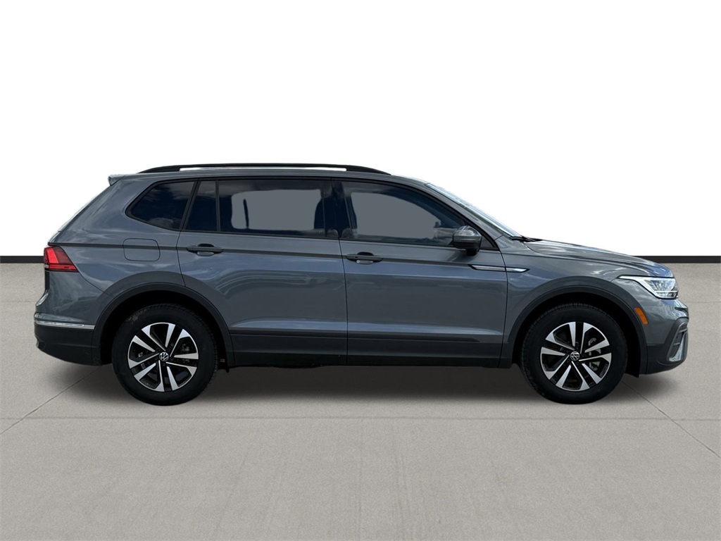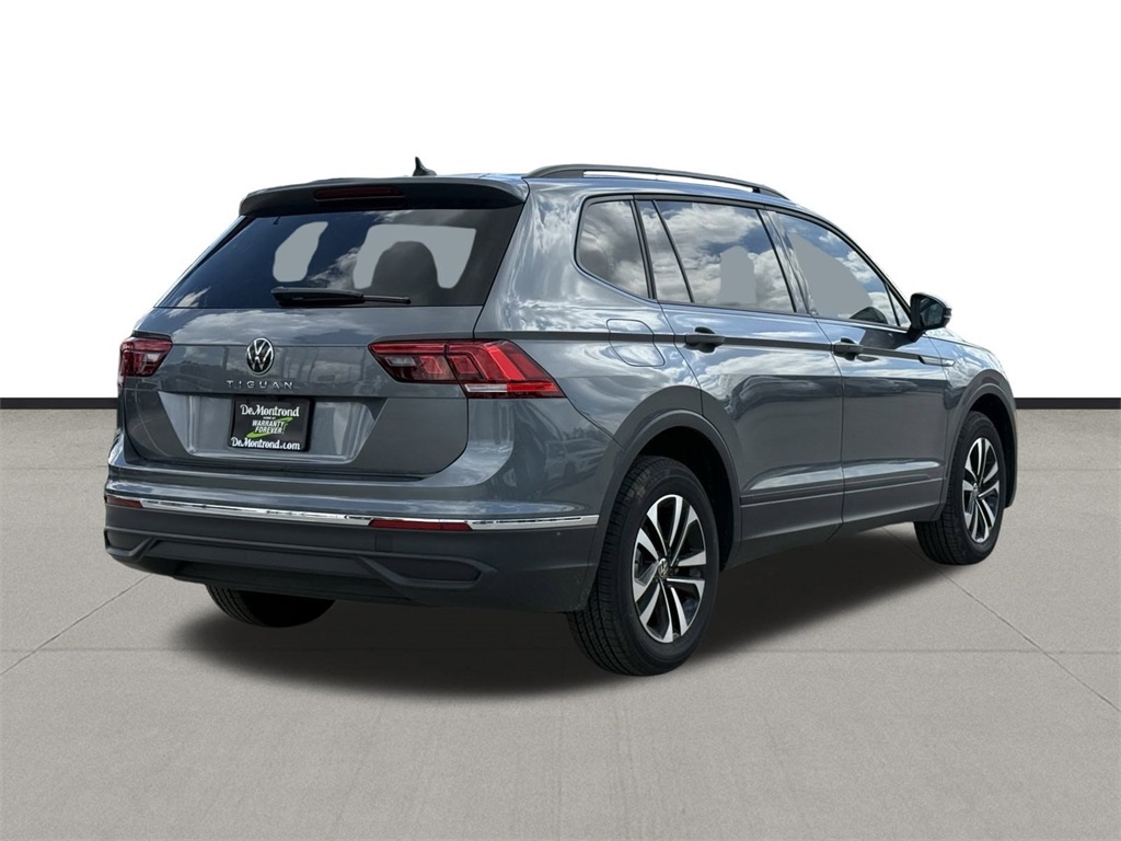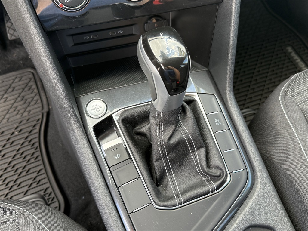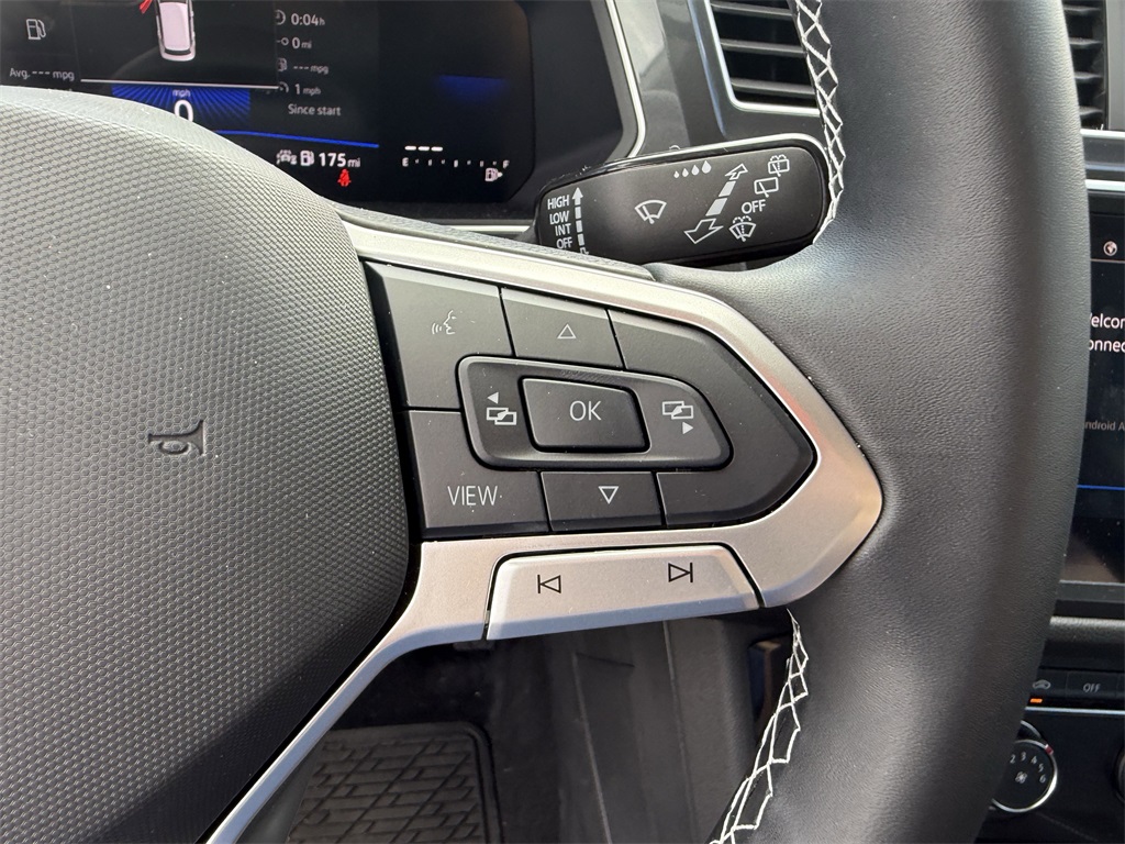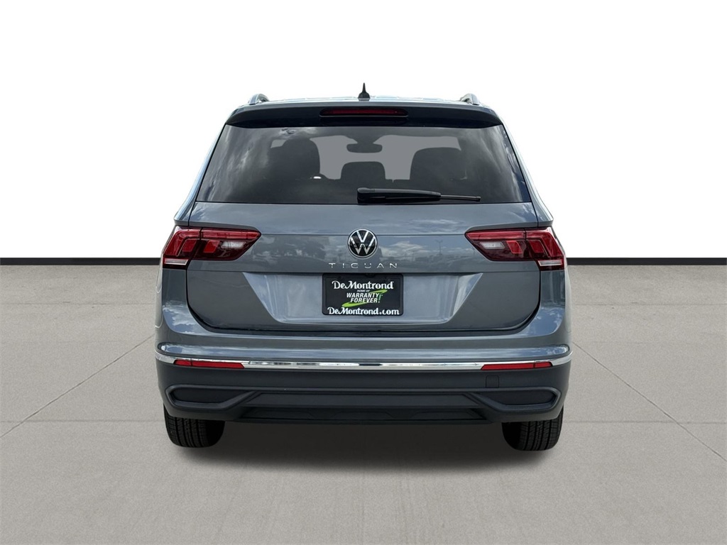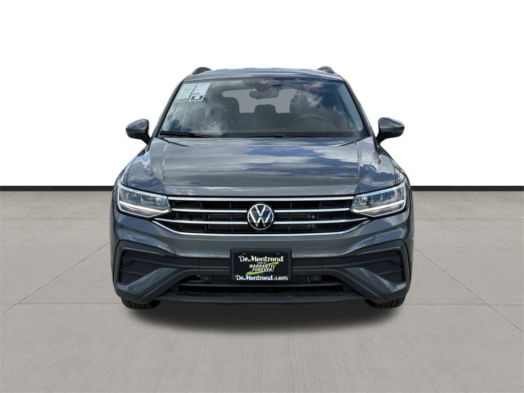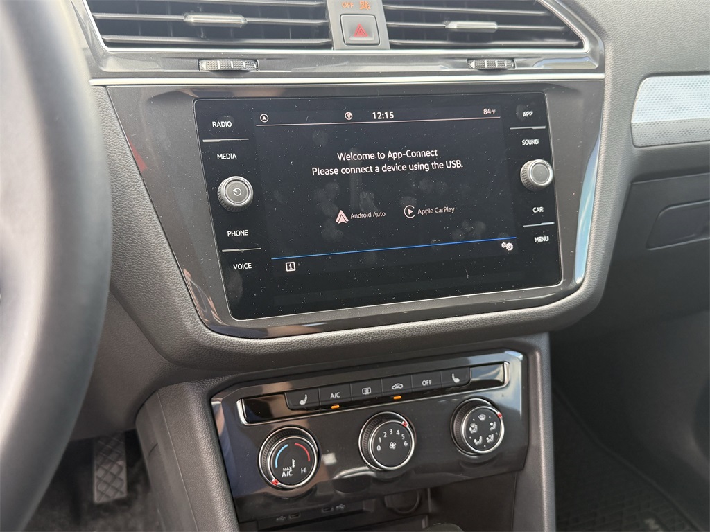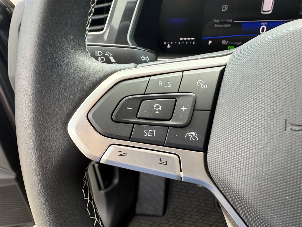 ake assist, Bumpers: body-color, Compass, Delay-off headlights, Driver door bin, Driver vanity mirror, Dual front impact airbags, Dual front side impact airbags, Electronic Stability Control, Emergency communication system: VW Car-Net Safe & Secure 5-year, Exterior Parking Camera Rear, Four wheel independent suspension, Front anti-roll bar, Front Bucket Seats, Front Center Armrest, Front dual zone A/C, Front reading lights, Fully automatic headlights, Heated door mirrors, Heated Front Seats, Heated front seats, Illuminated entry, Leather Shift Knob, Leather steering wheel, Low tire pressure warning, Occupant sensing airbag, Outside temperature display, Overhead airbag, Overhead console, Panic alarm, Passenger door bin, Passenger vanity mirror, Perforated V-Tex Leatherette Seating Surfaces, Power door mirrors, Power driver seat, Power Liftgate, Power moonroof, Power steering, Power windows, Radio data system, Radio: MIB3 Composition Media AM/FM/HD, Rain sensing wipers, Rear anti-roll bar, Rear reading lights, Rear seat center armrest, Rear window defroster, Rear window wiper, Remote keyless entry, Security system, Speed control, Speed-sensing steering, Split folding rear seat, Spoiler, Sport steering wheel, Steering wheel mounted audio controls, Tachometer, Telescoping steering wheel, Tilt steering wheel, Traction control, Trip computer, Turn signal indicator mirrors, Variably intermittent wipers, and Wheels: 19" Black Painted Twin 5-Spoke Alloy. 2024 Volkswagen Tiguan 2.0T SE R-Line Black 4D Sport Utility Gray 23/30 City/Highway MPG