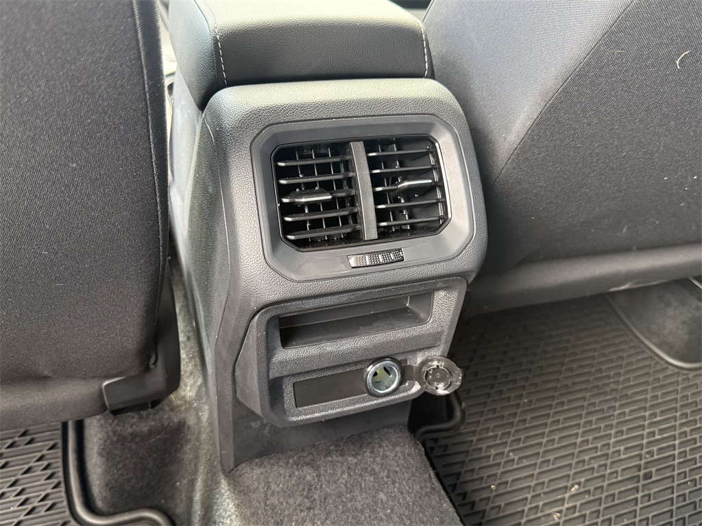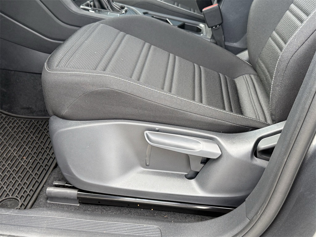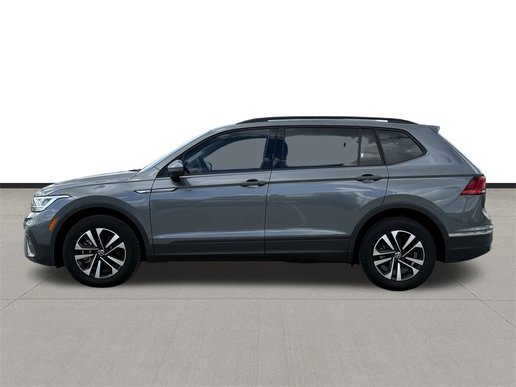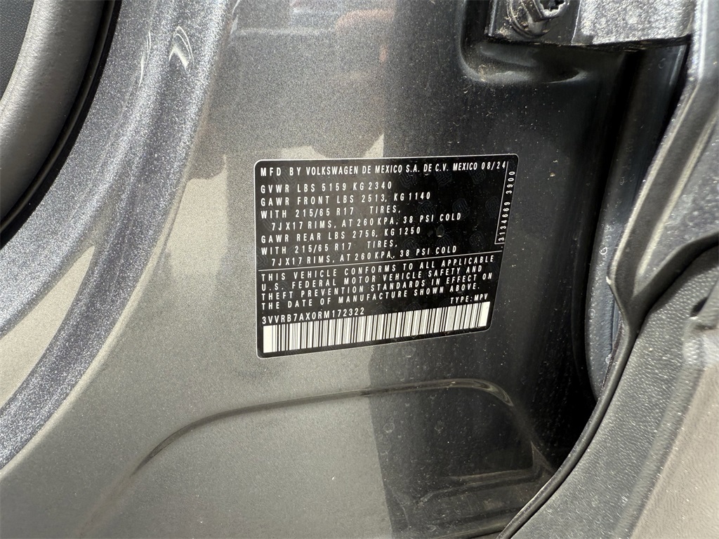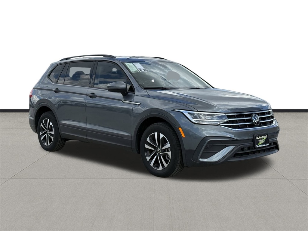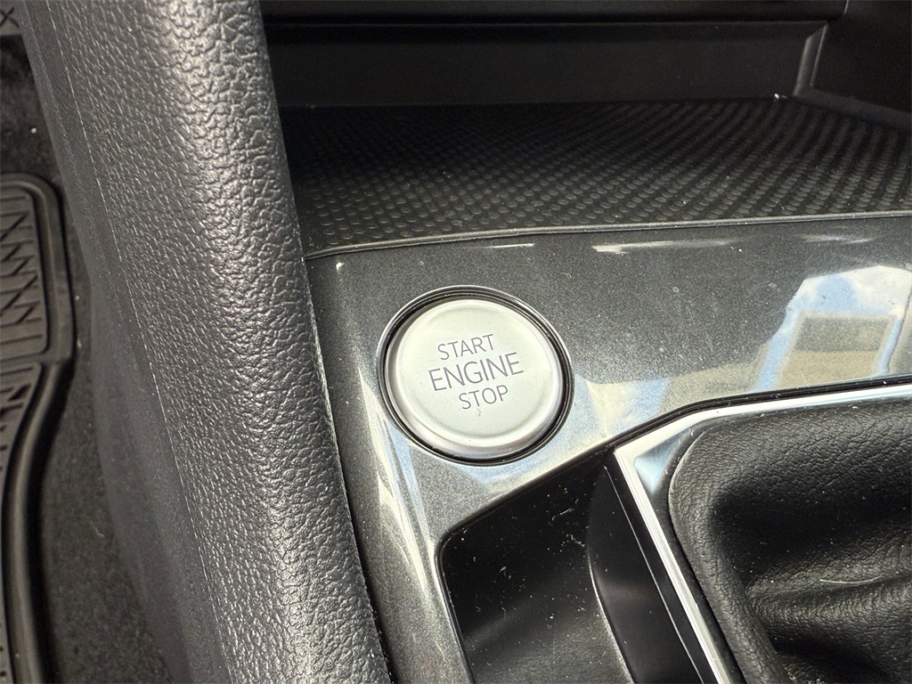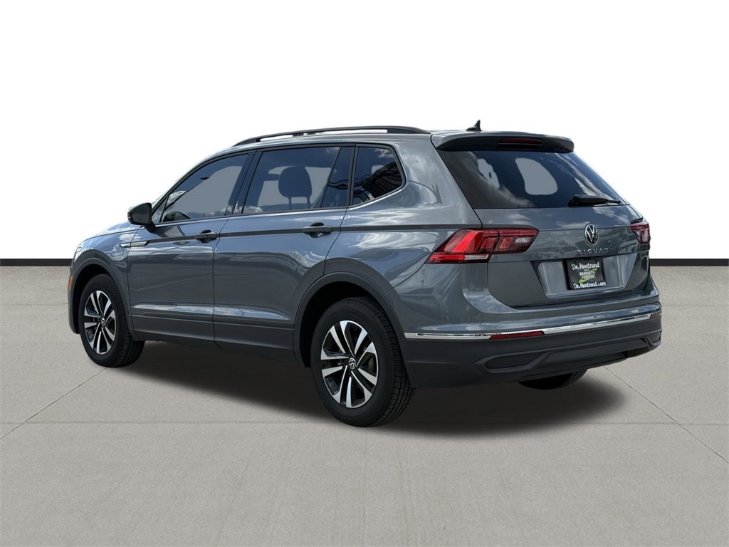 ake assist, Bumpers: body-color, Compass, Delay-off headlights, Driver door bin, Driver vanity mirror, Dual front impact airbags, Dual front side impact airbags, Electronic Stability Control, Emergency communication system: VW Car-Net Safe & Secure 5-year, Exterior Parking Camera Rear, Four wheel independent suspension, Front anti-roll bar, Front Bucket Seats, Front Center Armrest, Front dual zone A/C, Front reading lights, Fully automatic headlights, Heated door mirrors, Heated Front Seats, Heated front seats, Illuminated entry, Leather Shift Knob, Leather steering wheel, Low tire pressure warning, Occupant sensing airbag, Outside temperature display, Overhead airbag, Overhead console, Panic alarm, Passenger door bin, Passenger vanity mirror, Perforated V-Tex Leatherette Seating Surfaces, Power door mirrors, Power driver seat, Power Liftgate, Power moonroof, Power steering, Power windows, Radio data system, Radio: MIB3 Composition Media AM/FM/HD, Rain sensing wipers, Rear anti-roll bar, Rear reading lights, Rear seat center armrest, Rear window defroster, Rear window wiper, Remote keyless entry, Security system, Speed control, Speed-sensing steering, Split folding rear seat, Spoiler, Sport steering wheel, Steering wheel mounted audio controls, Tachometer, Telescoping steering wheel, Tilt steering wheel, Traction control, Trip computer, Turn signal indicator mirrors, Variably intermittent wipers, and Wheels: 19" Black Painted Twin 5-Spoke Alloy. 2024 Volkswagen Tiguan 2.0T SE R-Line Black 4D Sport Utility Gray 23/30 City/Highway MPG