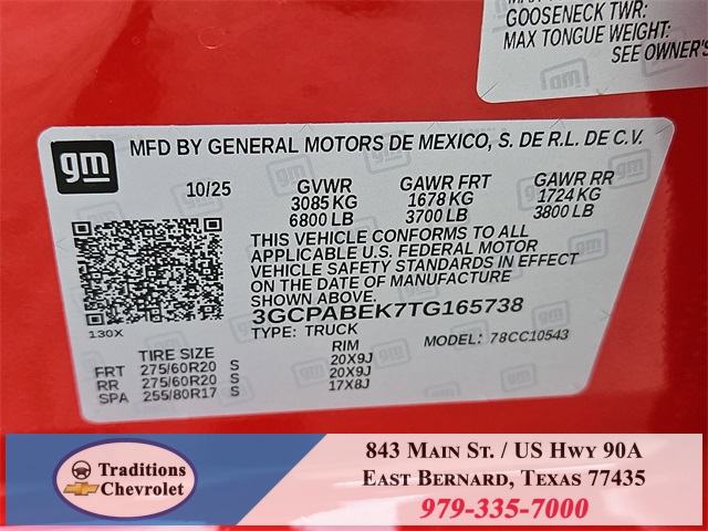 ted Power Outlet, 120-Volt Interior Power Outlet, 3.42 Rear Axle Ratio, 3.5" Monochromatic Display Driver Info Center, 4-Wheel Disc Brakes, 40/20/40 Front Split-Bench Seat, 6 Speakers, 6-Speaker Audio System, ABS brakes, Air Conditioning, Alloy wheels, AM/FM radio: SiriusXM, Apple CarPlay/Android Auto, Auto High-beam Headlights, Automatic Emergency Braking, Bluetooth® For Phone, Brake assist, Bumpers: body-color, Chevytec Spray-On Black Bedliner, Cloth Seat Trim, Color-Keyed Carpeting Floor Covering, Compass, Deep-Tinted Glass, Delay-off headlights, Driver door bin, Driver vanity mirror, Dual front impact airbags, Dual front side impact airbags, Dual Rear USB Ports (Charge Only), Electronic Cruise Control, Electronic Stability Control, Emergency communication system: OnStar, Following Distance Indicator, Forward Collision Alert, Front anti-roll bar, Front Center Armrest w/Storage, Front Frame-Mounted Black Recovery Hooks, Front Pedestrian Braking, Front reading lights, Front Rubberized Vinyl Floor Mats, Front wheel independent suspension, Fully automatic headlights, HD Rear Vision Camera, Heated door mirrors, Illuminated entry, IntelliBeam Automatic High Beam On/Off, Lane Keep Assist w/Lane Departure Warning, Low tire pressure warning, Manual Tilt Wheel Steering Column, Multi-Flex Tailgate, Occupant sensing airbag, OnStar Services Capable, Outside temperature display, Overhead airbag, Overhead console, Panic alarm, Passenger door bin, Passenger vanity mirror, Power door mirrors, Power driver seat, Power Front Windows w/Driver Express Up/Down, Power Front Windows w/Passenger Express Down, Power Rear Windows w/Express Down, Power steering, Power windows, Premium audio system: Chevrolet Infotainment 3, Radio data system, Radio: Chevrolet Infotainment 3 System, Rear 60/40 Folding Bench Seat (Folds Up), Rear reading lights, Rear Rubberized-Vinyl Floor Mats, Rear step bumper, Rear window defroster, Remote Keyless Entry, Remote keyless entry, Security system, SiriusXM Trial Subscription, Speed control, Speed-sensing steering, Split folding rear seat, Standard Tailgate, Tachometer, Teen Driver, Tilt steering wheel, Tire Pressure Monitoring System, Traction control, Trip computer, Variably intermittent wipers, Voltmeter, Wheels: 20" x 9" Bright Silver Painted Aluminum, Wheels: 20" x 9" High Gloss Black Painted Alum, and Wi-Fi Hot Spot Capable. Tax, title, license and dealer fees (unless itemized above) are extra. Not available with special finance or lease offers. See Dealer for Details. Price includes: $1000 - Bonus Cash. Exp. 11/03/2025 $1750 - Customer Cash. Exp. 11/03/2025