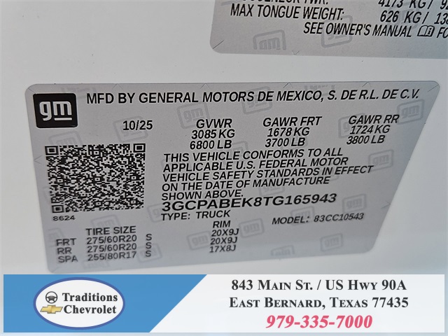 ar Axle Ratio, 3.5" Monochromatic Display Driver Info Center, 4-Wheel Disc Brakes, 40/20/40 Front Split-Bench Seat, 6 Speakers, 6-Speaker Audio System, ABS brakes, Air Conditioning, Alloy wheels, AM/FM radio: SiriusXM, Apple CarPlay/Android Auto, Auto High-beam Headlights, Automatic Emergency Braking, Bluetooth® For Phone, Brake assist, Bumpers: body-color, Chevytec Spray-On Black Bedliner, Cloth Seat Trim, Color-Keyed Carpeting Floor Covering, Compass, Deep-Tinted Glass, Delay-off headlights, Driver door bin, Driver vanity mirror, Dual front impact airbags, Dual front side impact airbags, Dual Rear USB Ports (Charge Only), Electronic Cruise Control, Electronic Stability Control, Emergency communication system: OnStar, Following Distance Indicator, Forward Collision Alert, Front anti-roll bar, Front Center Armrest w/Storage, Front Frame-Mounted Black Recovery Hooks, Front Pedestrian Braking, Front reading lights, Front Rubberized Vinyl Floor Mats, Front wheel independent suspension, Fully automatic headlights, HD Rear Vision Camera, Heated door mirrors, Illuminated entry, IntelliBeam Automatic High Beam On/Off, Lane Keep Assist w/Lane Departure Warning, Low tire pressure warning, Manual Tilt Wheel Steering Column, Multi-Flex Tailgate, Occupant sensing airbag, OnStar Services Capable, Outside temperature display, Overhead airbag, Overhead console, Panic alarm, Passenger door bin, Passenger vanity mirror, Power door mirrors, Power driver seat, Power Front Windows w/Driver Express Up/Down, Power Front Windows w/Passenger Express Down, Power Rear Windows w/Express Down, Power steering, Power windows, Premium audio system: Chevrolet Infotainment 3, Radio data system, Radio: Chevrolet Infotainment 3 System, Rear 60/40 Folding Bench Seat (Folds Up), Rear reading lights, Rear Rubberized-Vinyl Floor Mats, Rear step bumper, Rear window defroster, Remote Keyless Entry, Remote keyless entry, Security system, SiriusXM Trial Subscription, Speed control, Speed-sensing steering, Split folding rear seat, Standard Tailgate, Tachometer, Teen Driver, Tilt steering wheel, Tire Pressure Monitoring System, Traction control, Trip computer, Variably intermittent wipers, Voltmeter, Wheels: 20" x 9" Bright Silver Painted Aluminum, Wheels: 20" x 9" High Gloss Black Painted Alum, and Wi-Fi Hot Spot Capable. Tax, title, license and dealer fees (unless itemized above) are extra. Not available with special finance or lease offers. See Dealer for Details. Price includes: $1000 - Bonus Cash. Exp. 11/03/2025 $1750 - Customer Cash. Exp. 11/03/2025