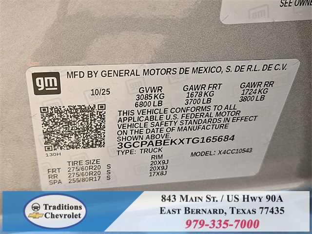 ar Axle Ratio, 3.5" Monochromatic Display Driver Info Center, 4-Wheel Disc Brakes, 40/20/40 Front Split-Bench Seat, 6 Speakers, 6-Speaker Audio System, ABS brakes, Air Conditioning, Alloy wheels, AM/FM radio: SiriusXM, Apple CarPlay/Android Auto, Auto High-beam Headlights, Automatic Emergency Braking, Bluetooth® For Phone, Brake assist, Bumpers: body-color, Chevytec Spray-On Black Bedliner, Cloth Seat Trim, Color-Keyed Carpeting Floor Covering, Compass, Deep-Tinted Glass, Delay-off headlights, Driver door bin, Driver vanity mirror, Dual front impact airbags, Dual front side impact airbags, Dual Rear USB Ports (Charge Only), Electronic Cruise Control, Electronic Stability Control, Emergency communication system: OnStar, Following Distance Indicator, Forward Collision Alert, Front anti-roll bar, Front Center Armrest w/Storage, Front Frame-Mounted Black Recovery Hooks, Front Pedestrian Braking, Front reading lights, Front Rubberized Vinyl Floor Mats, Front wheel independent suspension, Fully automatic headlights, HD Rear Vision Camera, Heated door mirrors, Illuminated entry, IntelliBeam Automatic High Beam On/Off, Lane Keep Assist w/Lane Departure Warning, Low tire pressure warning, Manual Tilt Wheel Steering Column, Multi-Flex Tailgate, Occupant sensing airbag, OnStar Services Capable, Outside temperature display, Overhead airbag, Overhead console, Panic alarm, Passenger door bin, Passenger vanity mirror, Power door mirrors, Power driver seat, Power Front Windows w/Driver Express Up/Down, Power Front Windows w/Passenger Express Down, Power Rear Windows w/Express Down, Power steering, Power windows, Premium audio system: Chevrolet Infotainment 3, Radio data system, Radio: Chevrolet Infotainment 3 System, Rear 60/40 Folding Bench Seat (Folds Up), Rear reading lights, Rear Rubberized-Vinyl Floor Mats, Rear step bumper, Rear window defroster, Remote Keyless Entry, Remote keyless entry, Security system, SiriusXM Trial Subscription, Speed control, Speed-sensing steering, Split folding rear seat, Standard Tailgate, Tachometer, Teen Driver, Tilt steering wheel, Tire Pressure Monitoring System, Traction control, Trip computer, Variably intermittent wipers, Voltmeter, Wheels: 20" x 9" Bright Silver Painted Aluminum, Wheels: 20" x 9" High Gloss Black Painted Alum, and Wi-Fi Hot Spot Capable. Tax, title, license and dealer fees (unless itemized above) are extra. Not available with special finance or lease offers. See Dealer for Details. Price includes: $1000 - Bonus Cash. Exp. 11/03/2025 $1750 - Customer Cash. Exp. 11/03/2025