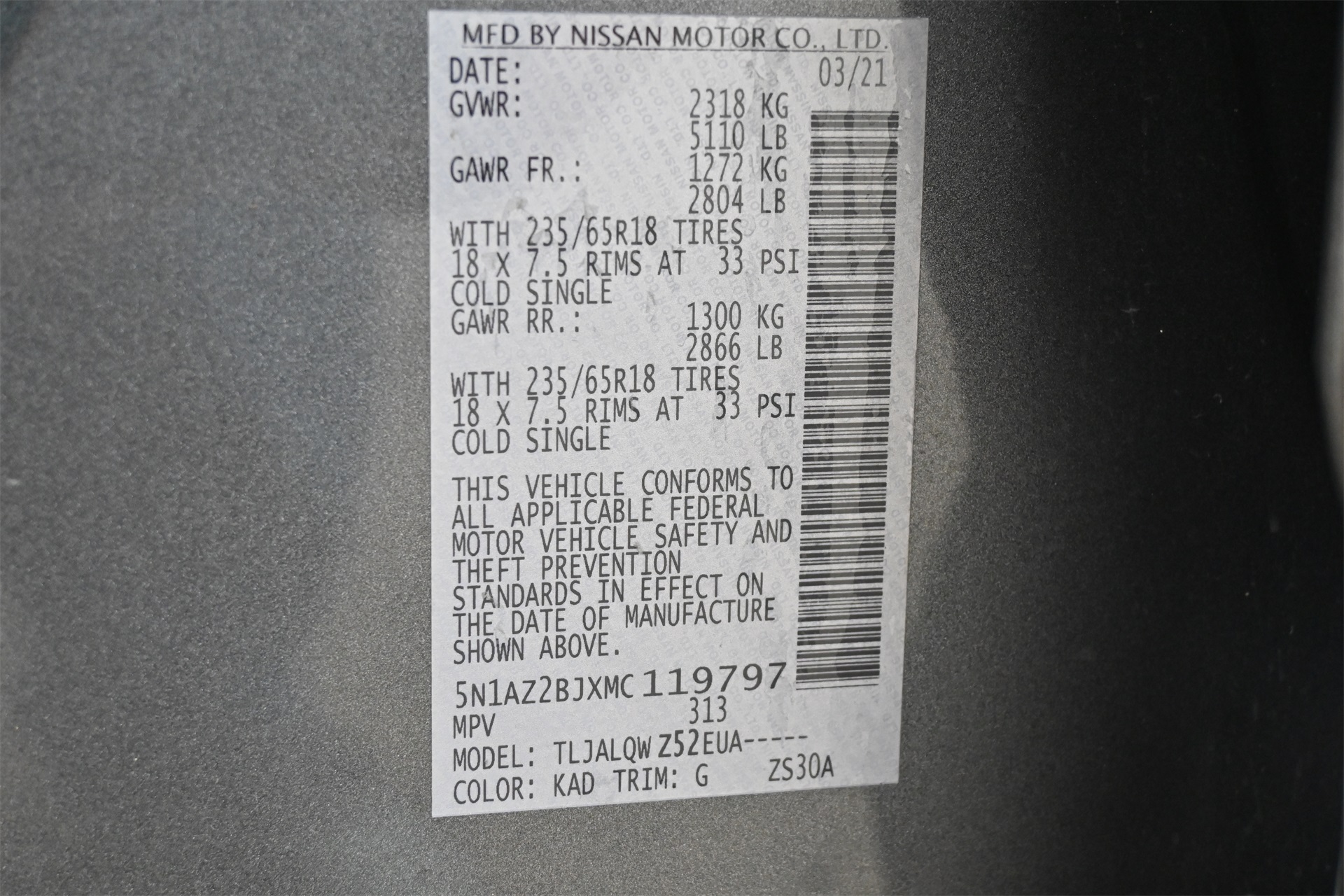 This 2021 Nissan Murano SV is loaded with the following Factory Options:CVT with Xtronic, 4-Wheel Disc Brakes, 4.667 Axle Ratio, 6 Speakers, ABS brakes, Air Conditioning, Alloy wheels, AM/FM radio: SiriusXM, AM/FM/CD/MP3/WMA Audio System, Auto High-beam Headlights, Auto-dimming Rear-View mirror, Automatic temperature control, Blind Spot Warning, Brake assist, Bumpers: body-color, Carpeted Floor Mats & Carpeted Cargo Mat, CD player, Child-Seat-Sensing Airbag, Cloth Seat Trim, Delay-off headlights