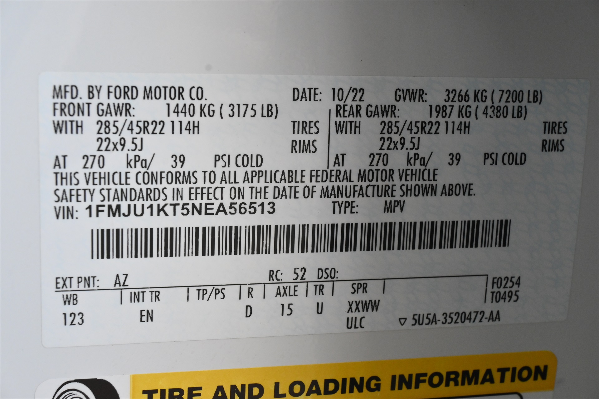 This 2022 Ford Expedition Limited is loaded with the following Factory Options:Equipment Group 302A High Package (Accent Color Twin Spar Grille), 12 Speakers, 3.31 Axle Ratio, 3.73 Axle Ratio, 3rd row seats: split-bench, 4-Wheel Disc Brakes, ABS brakes, Active Park Assist 2.0, Active Park Assist 2.0 Removal, Adjustable pedals, Air Conditioning, Alloy wheels, AM/FM radio: SiriusXM with 360L, Auto High-beam Headlights, Auto Start-Stop Removal, Auto-dimming door mirrors, Auto-dimming Rear-View mirr