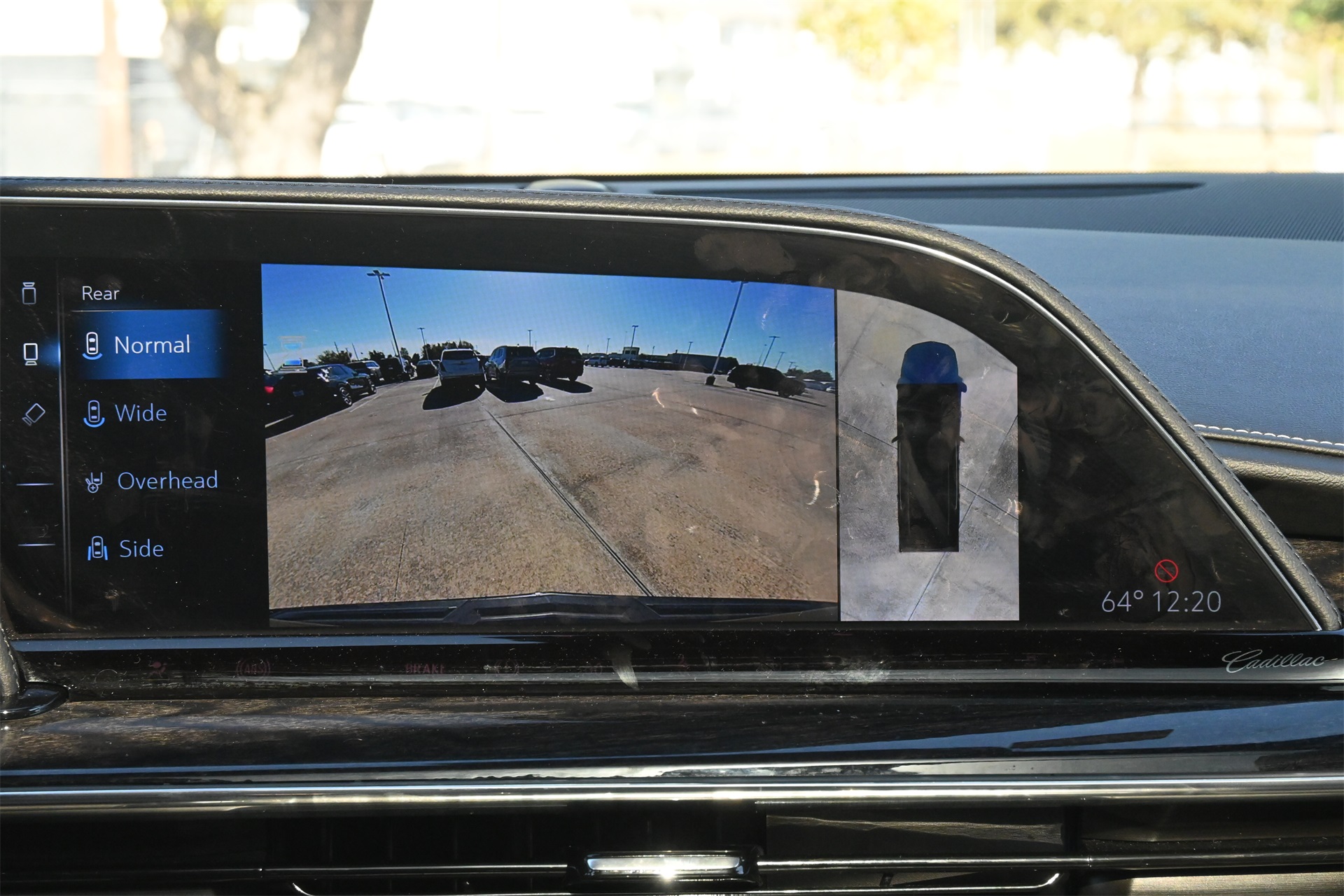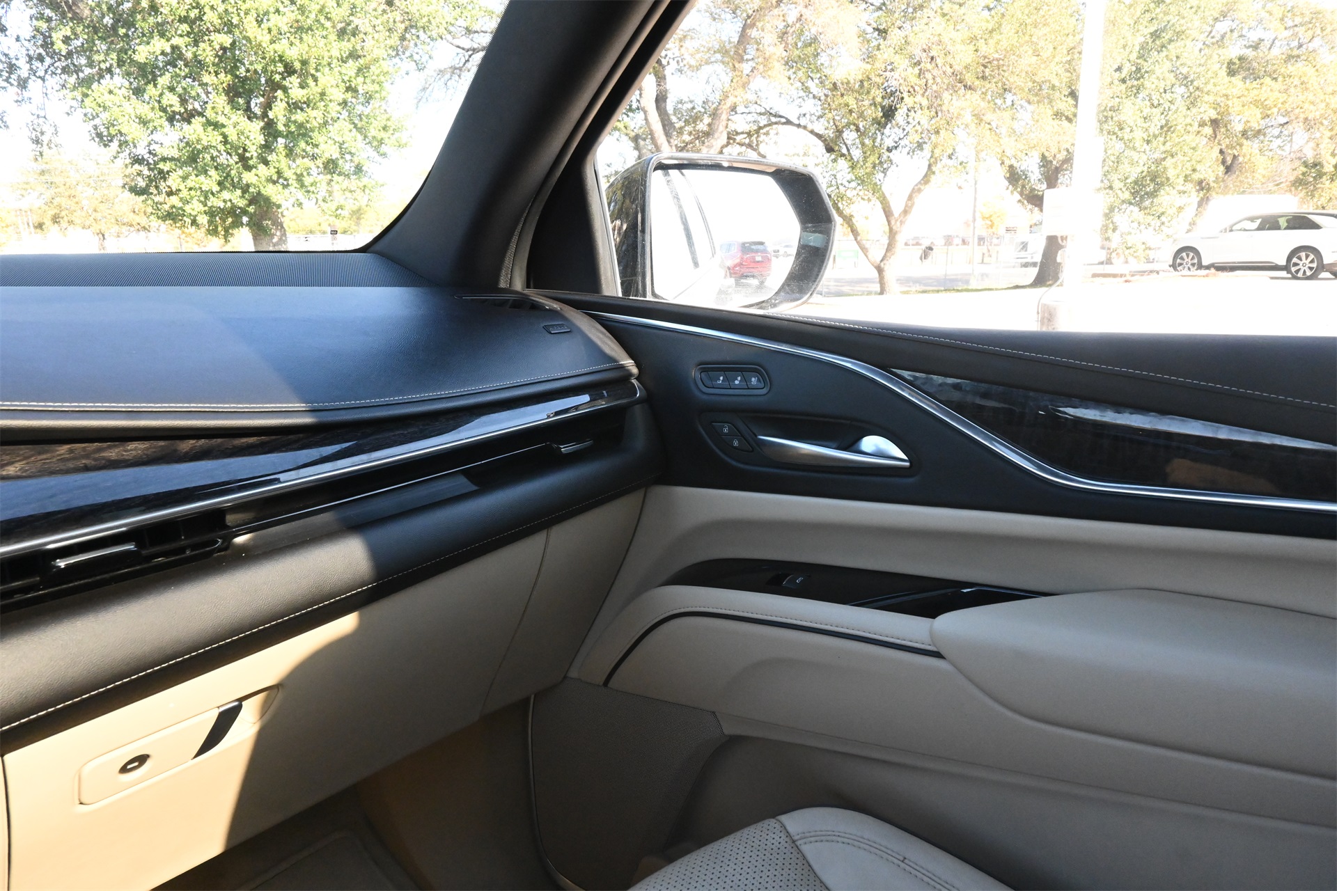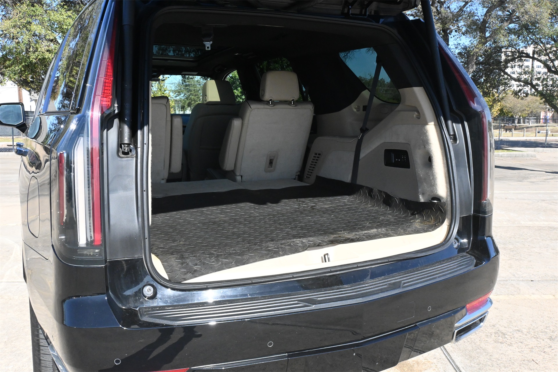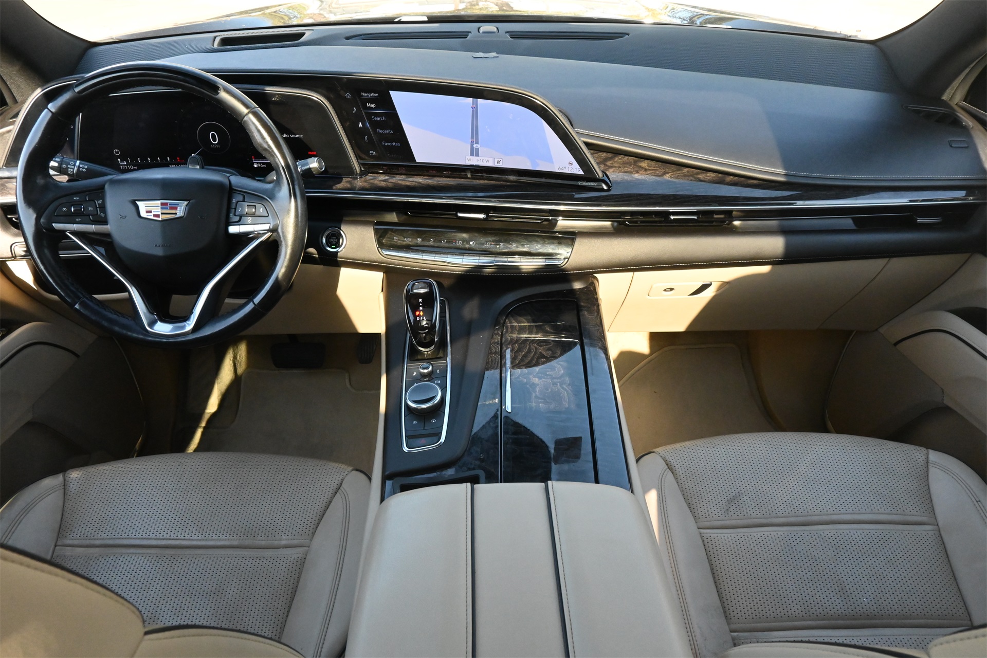 oof, Rear Camera Mirror, Rear Camera Mirror Washer, Rear Cross Traffic Alert, Reconfigurable Full-Color Head-Up Display, Reverse Automatic Braking, Running Board Assist Steps, Theft-Deterrent Alarm System, Vehicle Inclination Sensor, and Vehicle Interior Movement Sensor), Parchment With Jet Black Accents Leather, 16.9" Diagonal OLED Infotainment Screen, 19 Speakers, 2-Presets Memory For Driver Seat Adjuster, 2-Way Driver Power Lumbar Seat Adjuster, 2-Way Front Passenger Power Lumbar Seat Adjuster, 3 Years of OnStar & Connected Services Plan, 3.23 Axle Ratio, 3rd row seats: split-bench, 4-Way Power Driver Lumbar Seat Adjuster, 4-Way Power Front Passenger Lumbar Seat Adjuster, 4-Wheel Disc Brakes, 8-Way Power Driver Seat Adjuster, 8-Way Power Front Passenger Seat Adjuster, ABS brakes, Air Conditioning, Alloy wheels, AM/FM radio: SiriusXM with 360L, Apple CarPlay/Android Auto, Audio memory, Auto High-beam Headlights, Auto tilt-away steering wheel, Auto-dimming door mirrors, Auto-dimming Rear-View mirror, Automatic temperature control, Brake assist, Bumpers: body-color, Compass, Delay-off headlights, Driver door bin, Driver vanity mirror, Dual front impact airbags, Dual front side impact airbags, Electronic Stability Control, Emergency communication system: OnStar and Cadillac connected services capable, Exterior Parking Camera Rear, Four wheel independent suspension, Front anti-roll bar, Front Bucket Seats, Front Center Armrest w/Storage, Front dual zone A/C, Front License Plate Bracket, Front reading lights, Fully automatic headlights, Garage door transmitter, HD Radio, Heads-Up Display, Heated door mirrors, Heated Driver & Front Passenger Seats, Heated front seats, Heated rear seats, Heated steering wheel, Illuminated entry, Leather Seating Surfaces w/Mini-Chevron Perf Inserts, Low tire pressure warning, Memory seat, Navigation System, Not Equipped w/2nd Row Express-Up Window Control, Not Equipped w/4-Way Driver & Fr Pass Pwr Lumbar, Occupant sensing airbag, Outside temperature display, Overhead airbag, Overhead console, Panic alarm, Passenger door bin, Passenger vanity mirror, Power door mirrors, Power driver seat, Power Liftgate, Power moonroof, Power passenger seat, Power steering, Power windows, Premium Smooth Ride Suspension, Radio data system, Radio: AM/FM w/Navigation, Rain sensing wipers, Rear air conditioning, Rear anti-roll bar, Rear reading lights, Rear window defroster, Rear window wiper, Remote keyless entry, Security system, SiriusXM w/360L, Speed control, Split folding rear seat, Spoiler, Steering wheel memory, Steering wheel mounted audio controls, Super Cruise, Tachometer, Teen Driver, Telescoping steering wheel, Tilt steering wheel, Traction control, Trip computer, Turn signal indicator mirrors, Variably intermittent wipers, Ventilated front seats, Voltmeter, Wheel Locks, Wheels: 22" 14-Spoke Alloy w/Polished Finish, and Wireless Apple CarPlay/Wireless Android Auto. Black Raven RWD 10-Speed Automatic 6.2L V8 Local Trade, Bluetooth, Apple Carplay / Android Auto, Heated Seats, Cooled Seats, Parchment With Jet Black Accents Leather.