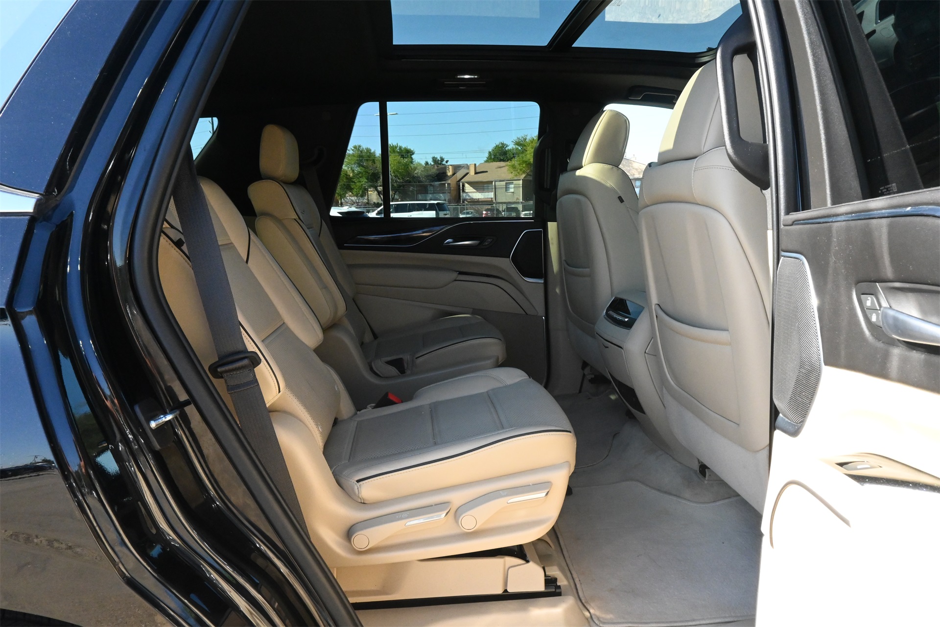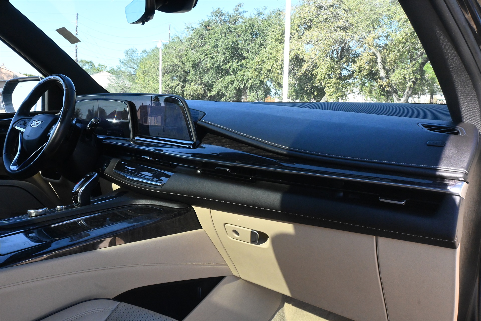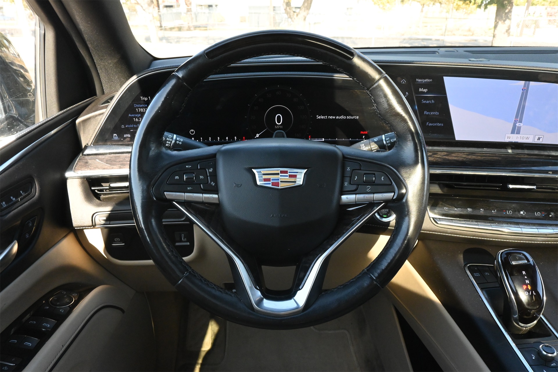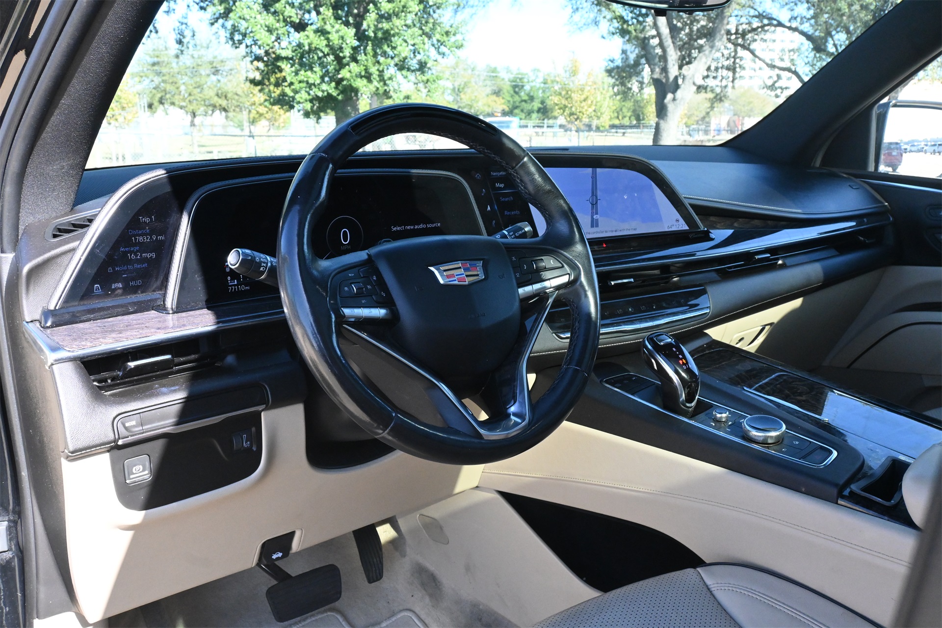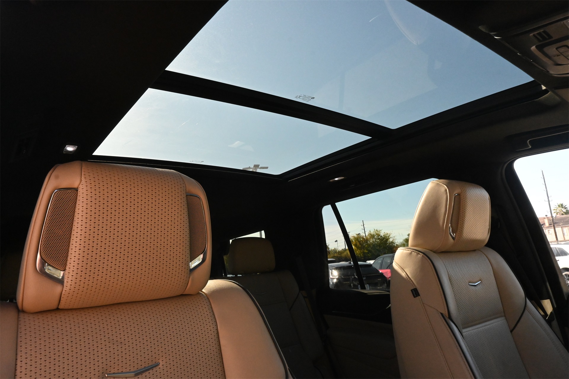 oof, Rear Camera Mirror, Rear Camera Mirror Washer, Rear Cross Traffic Alert, Reconfigurable Full-Color Head-Up Display, Reverse Automatic Braking, Running Board Assist Steps, Theft-Deterrent Alarm System, Vehicle Inclination Sensor, and Vehicle Interior Movement Sensor), Parchment With Jet Black Accents Leather, 16.9" Diagonal OLED Infotainment Screen, 19 Speakers, 2-Presets Memory For Driver Seat Adjuster, 2-Way Driver Power Lumbar Seat Adjuster, 2-Way Front Passenger Power Lumbar Seat Adjuster, 3 Years of OnStar & Connected Services Plan, 3.23 Axle Ratio, 3rd row seats: split-bench, 4-Way Power Driver Lumbar Seat Adjuster, 4-Way Power Front Passenger Lumbar Seat Adjuster, 4-Wheel Disc Brakes, 8-Way Power Driver Seat Adjuster, 8-Way Power Front Passenger Seat Adjuster, ABS brakes, Air Conditioning, Alloy wheels, AM/FM radio: SiriusXM with 360L, Apple CarPlay/Android Auto, Audio memory, Auto High-beam Headlights, Auto tilt-away steering wheel, Auto-dimming door mirrors, Auto-dimming Rear-View mirror, Automatic temperature control, Brake assist, Bumpers: body-color, Compass, Delay-off headlights, Driver door bin, Driver vanity mirror, Dual front impact airbags, Dual front side impact airbags, Electronic Stability Control, Emergency communication system: OnStar and Cadillac connected services capable, Exterior Parking Camera Rear, Four wheel independent suspension, Front anti-roll bar, Front Bucket Seats, Front Center Armrest w/Storage, Front dual zone A/C, Front License Plate Bracket, Front reading lights, Fully automatic headlights, Garage door transmitter, HD Radio, Heads-Up Display, Heated door mirrors, Heated Driver & Front Passenger Seats, Heated front seats, Heated rear seats, Heated steering wheel, Illuminated entry, Leather Seating Surfaces w/Mini-Chevron Perf Inserts, Low tire pressure warning, Memory seat, Navigation System, Not Equipped w/2nd Row Express-Up Window Control, Not Equipped w/4-Way Driver & Fr Pass Pwr Lumbar, Occupant sensing airbag, Outside temperature display, Overhead airbag, Overhead console, Panic alarm, Passenger door bin, Passenger vanity mirror, Power door mirrors, Power driver seat, Power Liftgate, Power moonroof, Power passenger seat, Power steering, Power windows, Premium Smooth Ride Suspension, Radio data system, Radio: AM/FM w/Navigation, Rain sensing wipers, Rear air conditioning, Rear anti-roll bar, Rear reading lights, Rear window defroster, Rear window wiper, Remote keyless entry, Security system, SiriusXM w/360L, Speed control, Split folding rear seat, Spoiler, Steering wheel memory, Steering wheel mounted audio controls, Super Cruise, Tachometer, Teen Driver, Telescoping steering wheel, Tilt steering wheel, Traction control, Trip computer, Turn signal indicator mirrors, Variably intermittent wipers, Ventilated front seats, Voltmeter, Wheel Locks, Wheels: 22" 14-Spoke Alloy w/Polished Finish, and Wireless Apple CarPlay/Wireless Android Auto. Black Raven RWD 10-Speed Automatic 6.2L V8 Local Trade, Bluetooth, Apple Carplay / Android Auto, Heated Seats, Cooled Seats, Parchment With Jet Black Accents Leather.