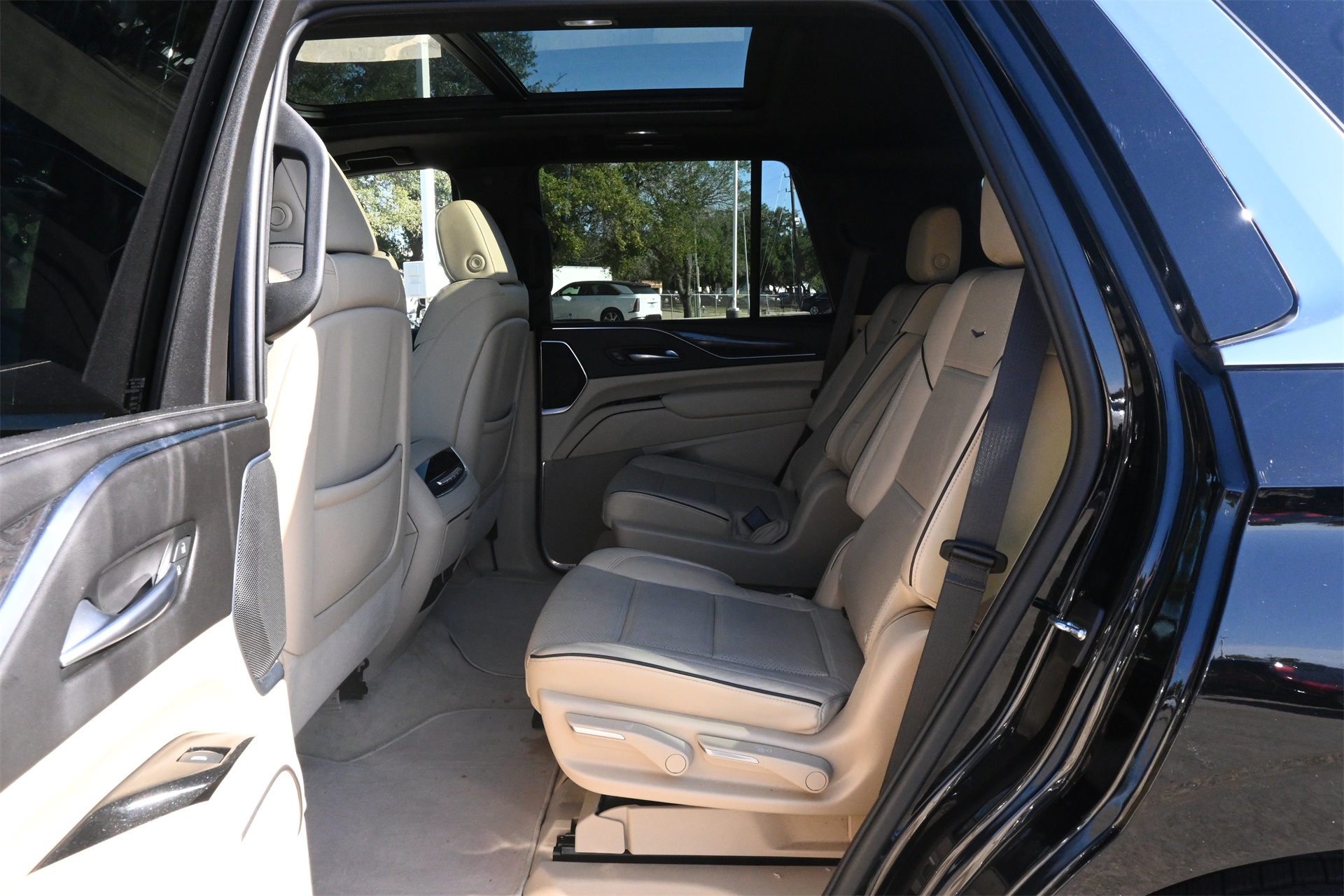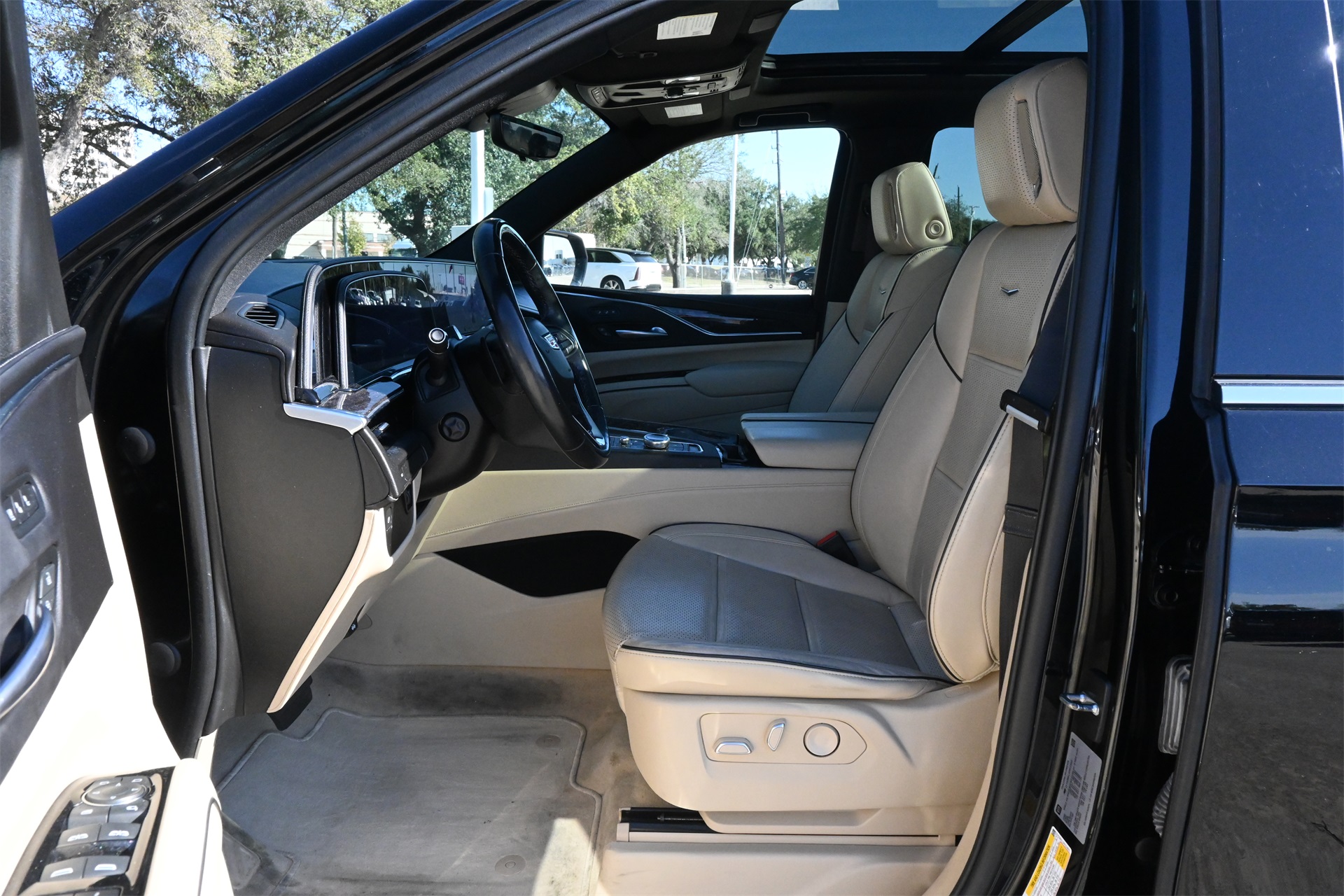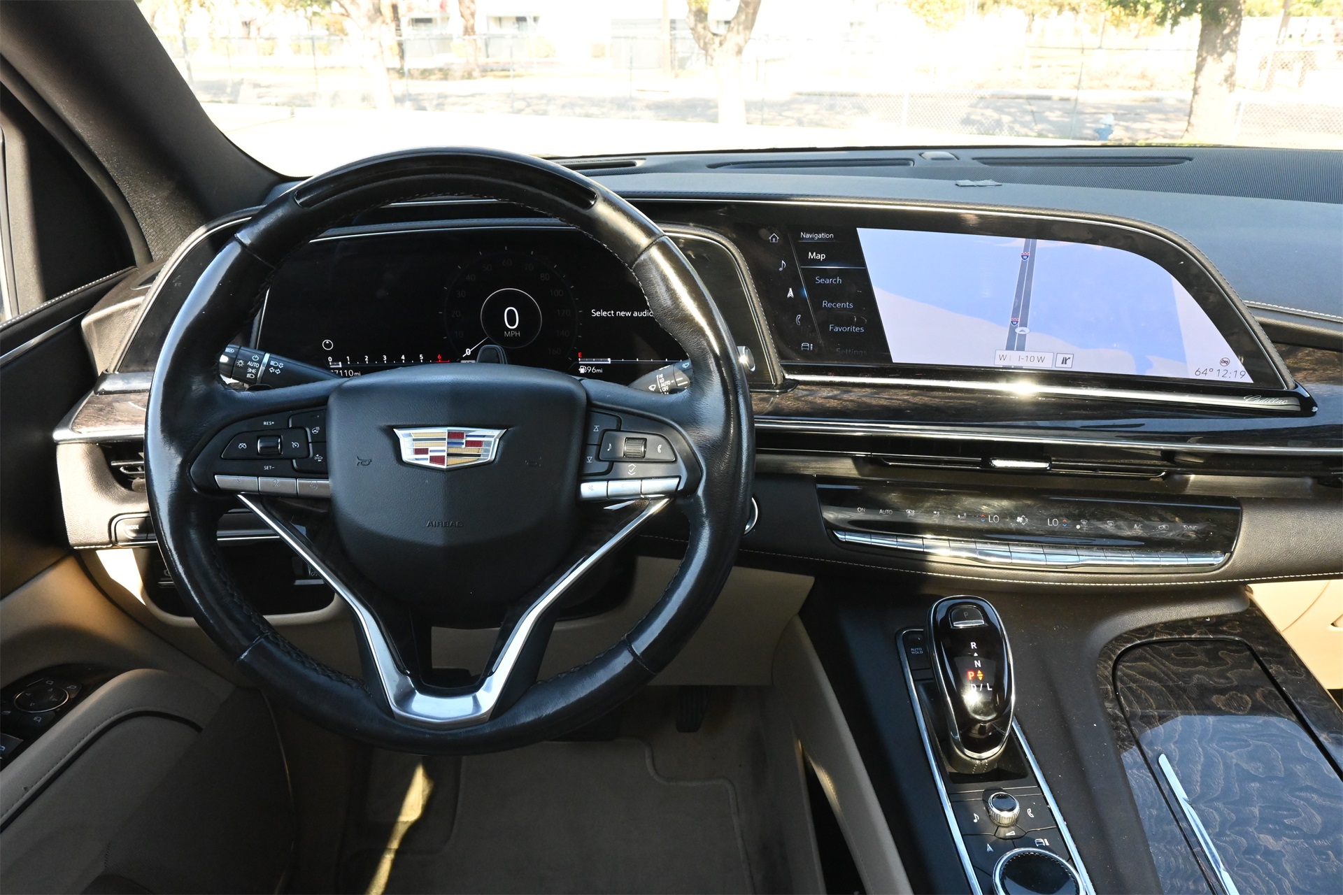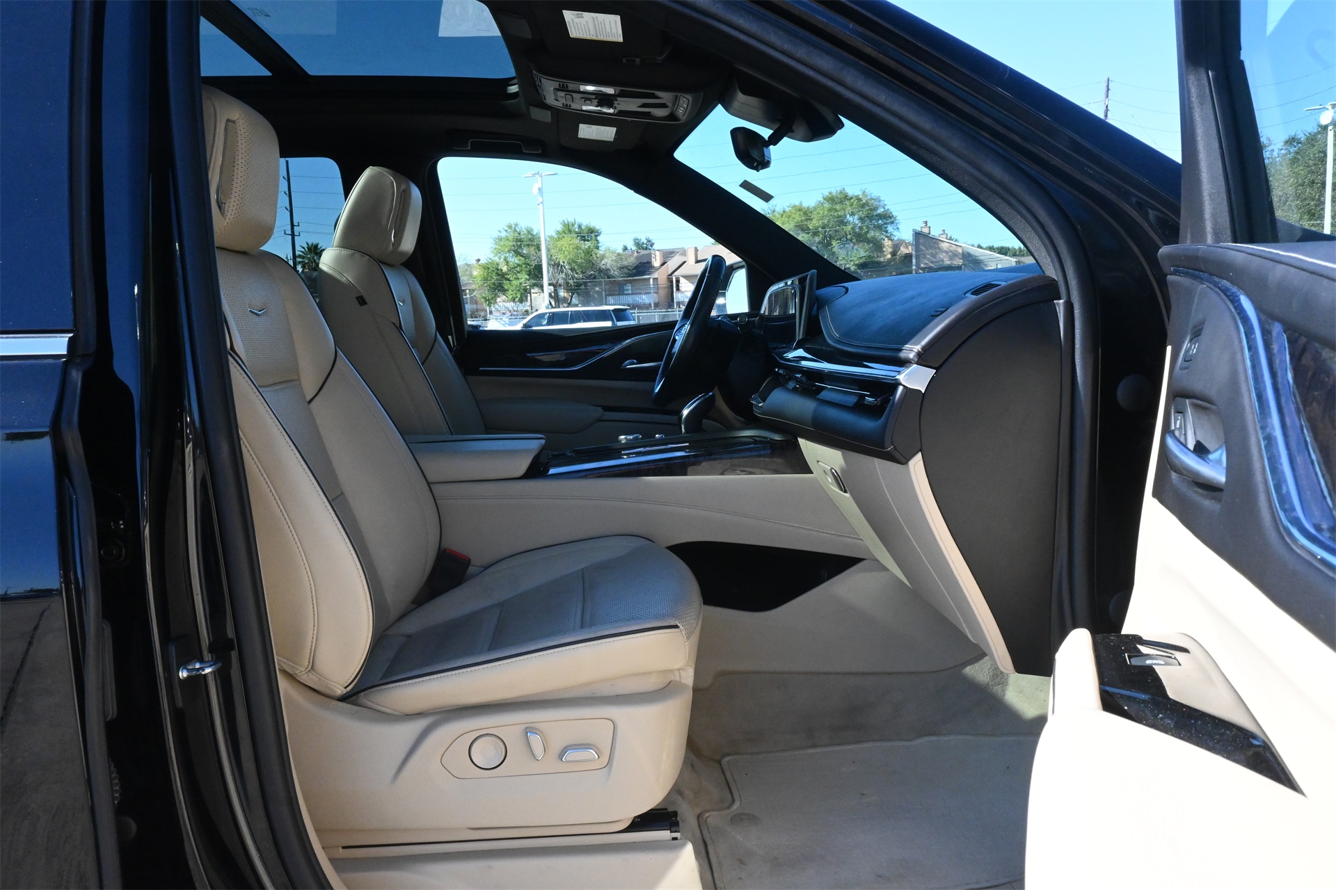 oof, Rear Camera Mirror, Rear Camera Mirror Washer, Rear Cross Traffic Alert, Reconfigurable Full-Color Head-Up Display, Reverse Automatic Braking, Running Board Assist Steps, Theft-Deterrent Alarm System, Vehicle Inclination Sensor, and Vehicle Interior Movement Sensor), Parchment With Jet Black Accents Leather, 16.9" Diagonal OLED Infotainment Screen, 19 Speakers, 2-Presets Memory For Driver Seat Adjuster, 2-Way Driver Power Lumbar Seat Adjuster, 2-Way Front Passenger Power Lumbar Seat Adjuster, 3 Years of OnStar & Connected Services Plan, 3.23 Axle Ratio, 3rd row seats: split-bench, 4-Way Power Driver Lumbar Seat Adjuster, 4-Way Power Front Passenger Lumbar Seat Adjuster, 4-Wheel Disc Brakes, 8-Way Power Driver Seat Adjuster, 8-Way Power Front Passenger Seat Adjuster, ABS brakes, Air Conditioning, Alloy wheels, AM/FM radio: SiriusXM with 360L, Apple CarPlay/Android Auto, Audio memory, Auto High-beam Headlights, Auto tilt-away steering wheel, Auto-dimming door mirrors, Auto-dimming Rear-View mirror, Automatic temperature control, Brake assist, Bumpers: body-color, Compass, Delay-off headlights, Driver door bin, Driver vanity mirror, Dual front impact airbags, Dual front side impact airbags, Electronic Stability Control, Emergency communication system: OnStar and Cadillac connected services capable, Exterior Parking Camera Rear, Four wheel independent suspension, Front anti-roll bar, Front Bucket Seats, Front Center Armrest w/Storage, Front dual zone A/C, Front License Plate Bracket, Front reading lights, Fully automatic headlights, Garage door transmitter, HD Radio, Heads-Up Display, Heated door mirrors, Heated Driver & Front Passenger Seats, Heated front seats, Heated rear seats, Heated steering wheel, Illuminated entry, Leather Seating Surfaces w/Mini-Chevron Perf Inserts, Low tire pressure warning, Memory seat, Navigation System, Not Equipped w/2nd Row Express-Up Window Control, Not Equipped w/4-Way Driver & Fr Pass Pwr Lumbar, Occupant sensing airbag, Outside temperature display, Overhead airbag, Overhead console, Panic alarm, Passenger door bin, Passenger vanity mirror, Power door mirrors, Power driver seat, Power Liftgate, Power moonroof, Power passenger seat, Power steering, Power windows, Premium Smooth Ride Suspension, Radio data system, Radio: AM/FM w/Navigation, Rain sensing wipers, Rear air conditioning, Rear anti-roll bar, Rear reading lights, Rear window defroster, Rear window wiper, Remote keyless entry, Security system, SiriusXM w/360L, Speed control, Split folding rear seat, Spoiler, Steering wheel memory, Steering wheel mounted audio controls, Super Cruise, Tachometer, Teen Driver, Telescoping steering wheel, Tilt steering wheel, Traction control, Trip computer, Turn signal indicator mirrors, Variably intermittent wipers, Ventilated front seats, Voltmeter, Wheel Locks, Wheels: 22" 14-Spoke Alloy w/Polished Finish, and Wireless Apple CarPlay/Wireless Android Auto. Black Raven RWD 10-Speed Automatic 6.2L V8 Local Trade, Bluetooth, Apple Carplay / Android Auto, Heated Seats, Cooled Seats, Parchment With Jet Black Accents Leather.