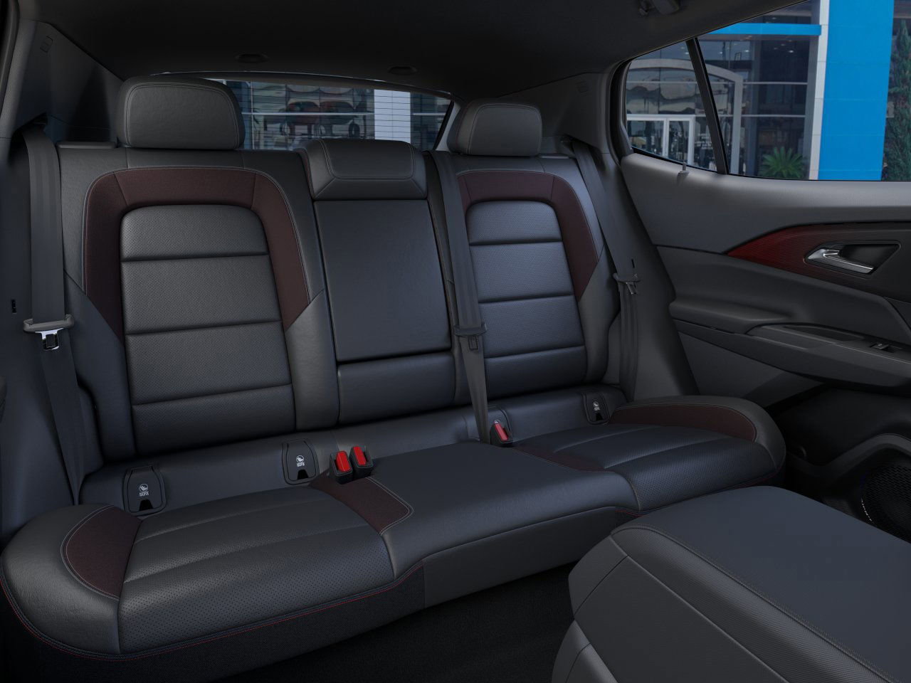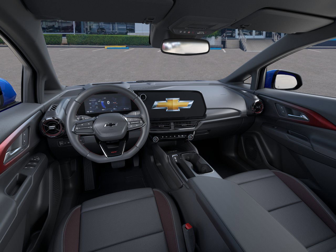 ch of luxury and functionality. Interior and Comfort: - Stylish black interior with sophisticated red accents. - Premium synthetic EvoTex seat trim for durability and comfort. - Front bucket seats with driver adjustable lumbar support. - Heated front seats and a heated steering wheel offer warmth and comfort in colder months. - Hands-free liftgate for easy access to the spacious trunk. Advanced Technology: - Dual-level charge cord with both 120-volt and 240-volt capabilities for versatile charging options. - Navigation system with satellite radio and WiFi hotspot require subscriptions for seamless connectivity. - Back-up camera and aerial view display system for enhanced parking assistance. - Adaptive cruise control and remote engine start for added convenience and ease. Safety Features: - Comprehensive safety suite including Lane Departure Warning, Lane Keeping Assist, Front Collision Mitigation, and Blind Spot Monitor. - Rear parking aid and cross-traffic alert to prevent accidents. - Equipped with multiple airbags including front side, front head, and knee airbags for maximum protection. Performance and Efficiency: - Front-wheel drive with an electric motor powered by a Nickel Cobalt Manganese traction battery ensures efficient and eco-friendly performance. - Automatic high beams and daytime running lights for improved visibility on the road. - Electric drive unit for a smooth and silent ride. The 2025 Chevrolet Equinox EV RS is designed for those who seek a blend of mode