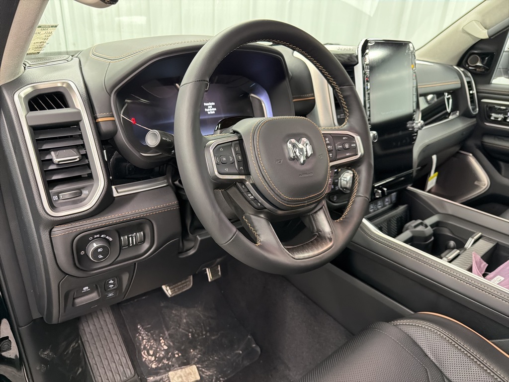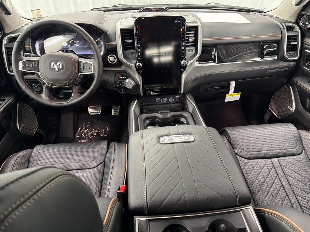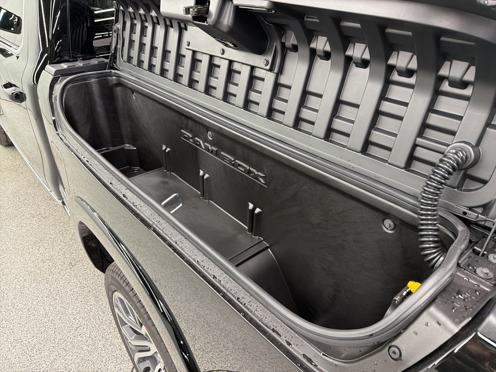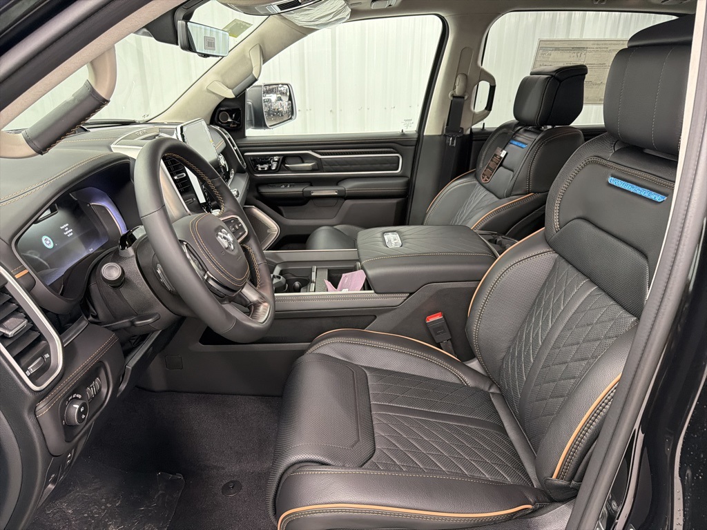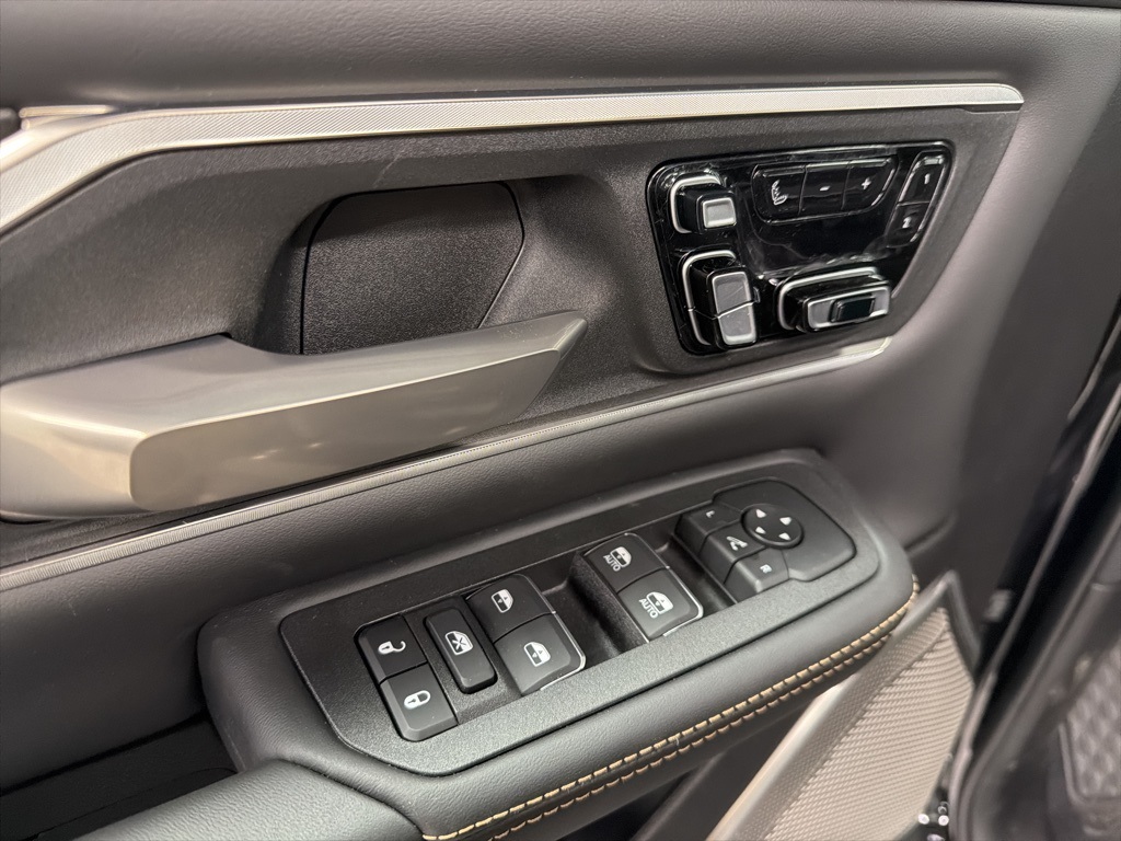 r 115V AC Outlet, MOPAR 4 Adjustable Cargo Tie-Down Hooks, and Truck Bed Cargo Divider), Quick Order Package 22V Tungsten, 12-Way/1-Way Trailer Connector, 3.92 Rear Axle Ratio, 4-Wheel Disc Brakes, ABS brakes, Adjustable pedals, Air Conditioning, Alloy wheels, AM/FM radio, Apple CarPlay/Android Auto, Audio memory, Auto High-beam Headlights, Auto Power-Folding Mirrors, Auto-dimming door mirrors, Auto-Dimming Exterior Driver Mirror, Auto-dimming Rear-View mirror, Auto-leveling suspension, Automatic temperature control, Bodyside moldings, Brake assist, Bumpers: body-color, Chrome Exterior Mirrors, Compass, Delay-off headlights, Driver door bin, Driver vanity mirror, Dual front impact airbags, Dual front side impact airbags, Electronic Stability Control, Exterior Mirrors Courtesy Lamps, Exterior Mirrors with Heating Element, Exterior Mirrors with Memory, Exterior Mirrors with Supplemental Signals, Exterior Parking Camera Rear, Front anti-roll bar, Front Bucket Seats, Front Center Armrest w/Storage, Front dual zone A/C, Front fog lights, Front License Plate Bracket, Front reading lights, Front wheel independent suspension, Fully automatic headlights, Garage door transmitter, Heads-Up Display, Heated door mirrors, Heated front seats, Heated rear seats, Heated steering wheel, Illuminated entry, Leather steering wheel, Low tire pressure warning, Memory seat, Multi-Function Tailgate, Navigation System, Occupant sensing airbag, Outside temperature display, Overhead airbag, Overhead console, Panic alarm, Passenger door bin, Passenger vanity mirror, Pedal memory, Power adjustable front head restraints, Power door mirrors, Power driver seat, Power moonroof, Power passenger seat, Power steering, Power windows, Premium Leather Bucket Seats, Radio data system, Radio: Uconnect 5 Nav with 14.4" Display, Rain sensing wipers, RAM's Head Badge, Rear anti-roll bar, Rear reading lights, Rear seat center armrest, Rear step bumper, Rear window defroster, Remote keyless entry, Remote Tailgate Release, Security system, Speed control, Split folding rear seat, Steering wheel mounted audio controls, Tachometer, Telescoping steering wheel, Tilt steering wheel, Traction control, Trailer Brake Control, Trip computer, Turn signal indicator mirrors, Variably intermittent wipers, Ventilated front seats, Ventilated rear seats, Voltmeter, and Wheels: 22" x 9" Polish/Painted with Inserts.