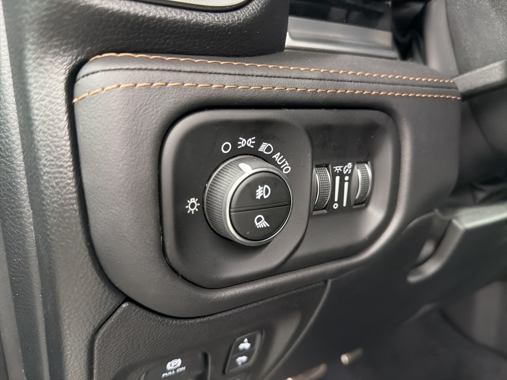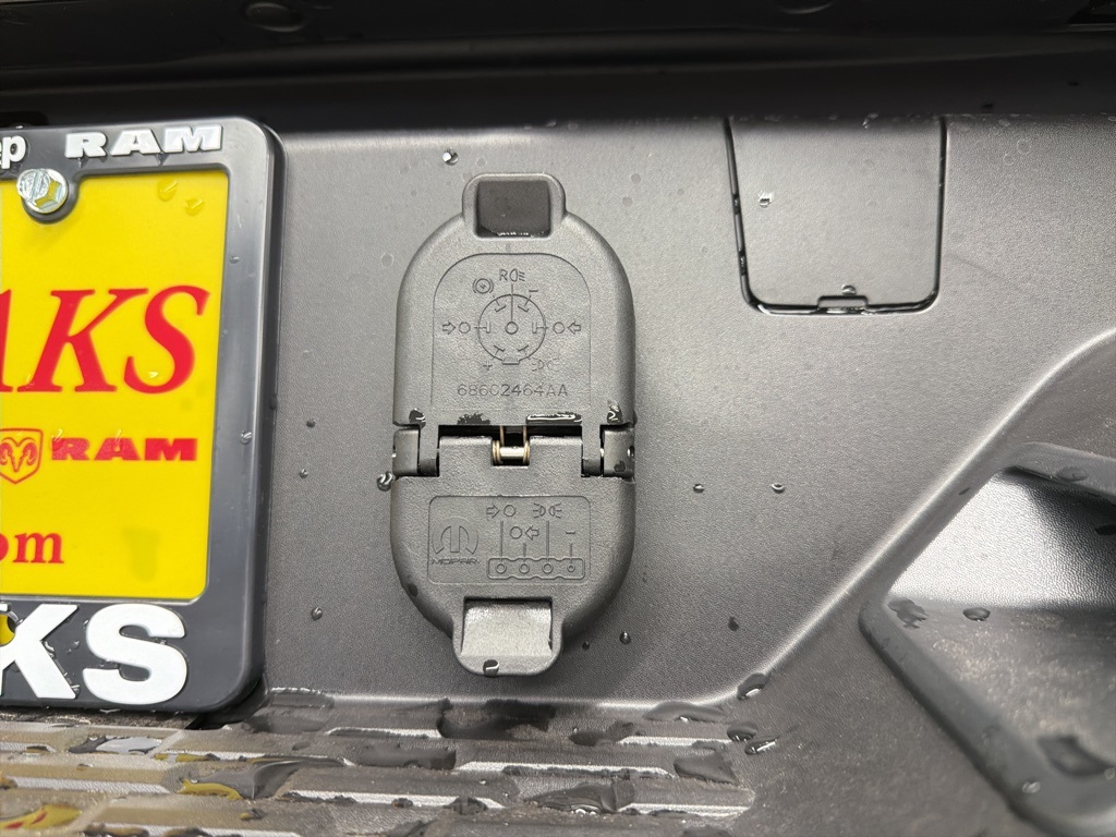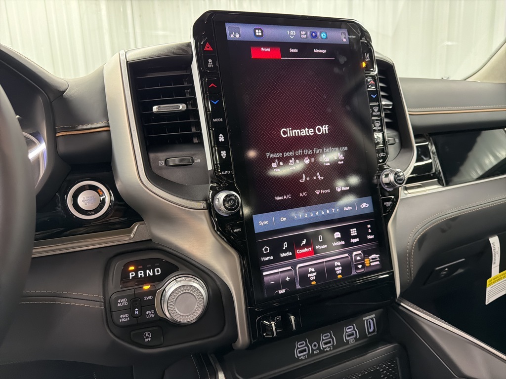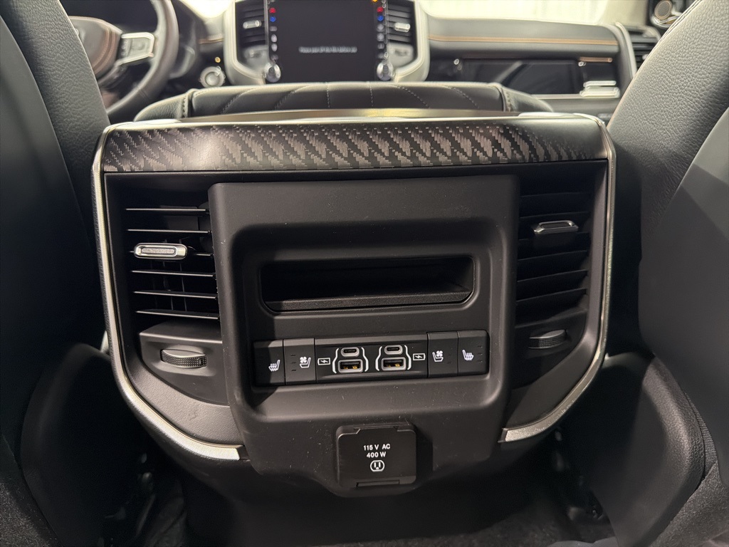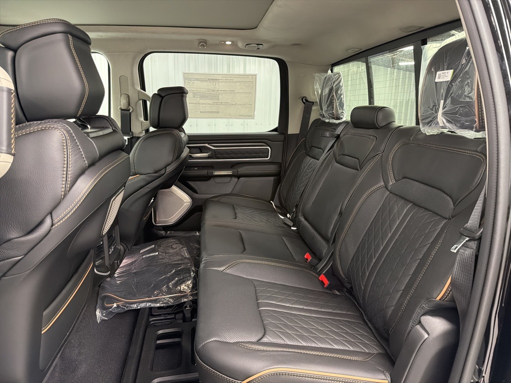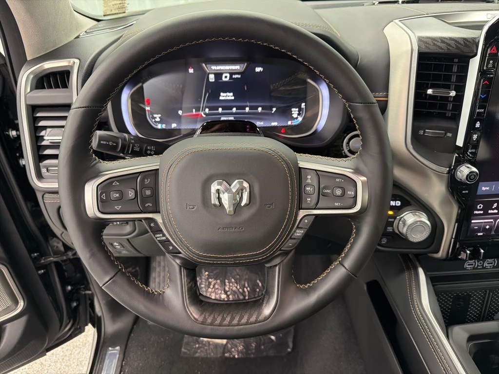 r 115V AC Outlet, MOPAR 4 Adjustable Cargo Tie-Down Hooks, and Truck Bed Cargo Divider), Quick Order Package 22V Tungsten, 12-Way/1-Way Trailer Connector, 3.92 Rear Axle Ratio, 4-Wheel Disc Brakes, ABS brakes, Adjustable pedals, Air Conditioning, Alloy wheels, AM/FM radio, Apple CarPlay/Android Auto, Audio memory, Auto High-beam Headlights, Auto Power-Folding Mirrors, Auto-dimming door mirrors, Auto-Dimming Exterior Driver Mirror, Auto-dimming Rear-View mirror, Auto-leveling suspension, Automatic temperature control, Bodyside moldings, Brake assist, Bumpers: body-color, Chrome Exterior Mirrors, Compass, Delay-off headlights, Driver door bin, Driver vanity mirror, Dual front impact airbags, Dual front side impact airbags, Electronic Stability Control, Exterior Mirrors Courtesy Lamps, Exterior Mirrors with Heating Element, Exterior Mirrors with Memory, Exterior Mirrors with Supplemental Signals, Exterior Parking Camera Rear, Front anti-roll bar, Front Bucket Seats, Front Center Armrest w/Storage, Front dual zone A/C, Front fog lights, Front License Plate Bracket, Front reading lights, Front wheel independent suspension, Fully automatic headlights, Garage door transmitter, Heads-Up Display, Heated door mirrors, Heated front seats, Heated rear seats, Heated steering wheel, Illuminated entry, Leather steering wheel, Low tire pressure warning, Memory seat, Multi-Function Tailgate, Navigation System, Occupant sensing airbag, Outside temperature display, Overhead airbag, Overhead console, Panic alarm, Passenger door bin, Passenger vanity mirror, Pedal memory, Power adjustable front head restraints, Power door mirrors, Power driver seat, Power moonroof, Power passenger seat, Power steering, Power windows, Premium Leather Bucket Seats, Radio data system, Radio: Uconnect 5 Nav with 14.4" Display, Rain sensing wipers, RAM's Head Badge, Rear anti-roll bar, Rear reading lights, Rear seat center armrest, Rear step bumper, Rear window defroster, Remote keyless entry, Remote Tailgate Release, Security system, Speed control, Split folding rear seat, Steering wheel mounted audio controls, Tachometer, Telescoping steering wheel, Tilt steering wheel, Traction control, Trailer Brake Control, Trip computer, Turn signal indicator mirrors, Variably intermittent wipers, Ventilated front seats, Ventilated rear seats, Voltmeter, and Wheels: 22" x 9" Polish/Painted with Inserts.