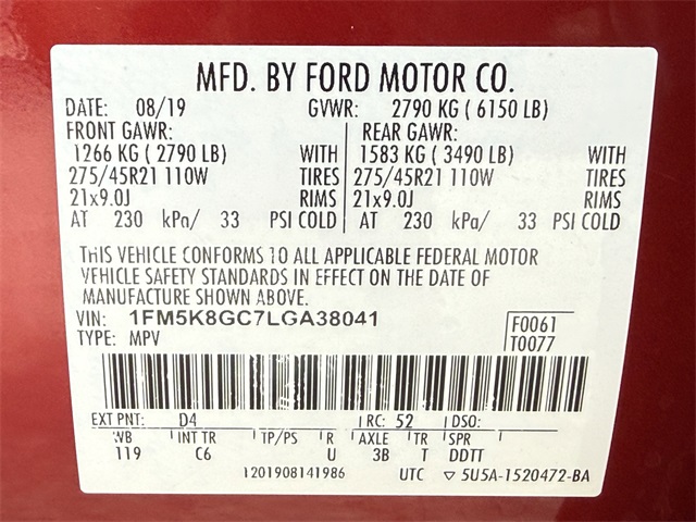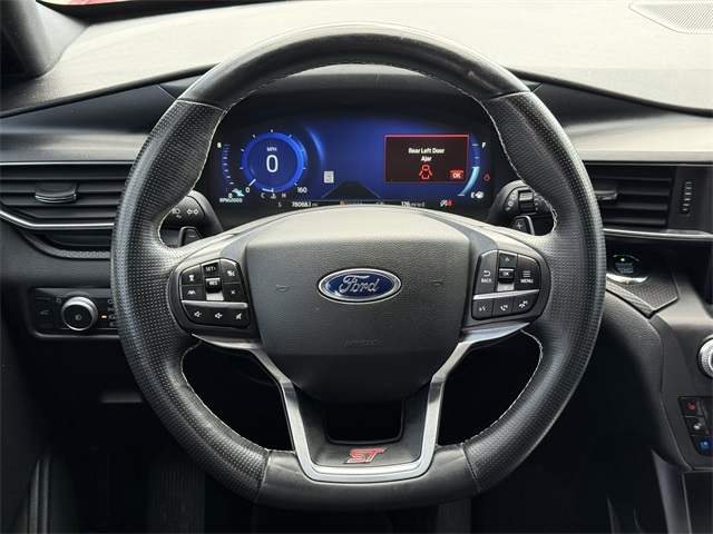 gs, Dual front side impact airbags, Electronic Stability Control, Emergency communication system: SYNC 3 911 Assist, Equipment Group 400A, Exterior Parking Camera Rear, FordPass Connect, Four wheel independent suspension, Front anti-roll bar, Front Bucket Seats, Front Center Armrest, Front dual zone A/C, Front fog lights, Front reading lights, Fully automatic headlights, Garage door transmitter: HomeLink, Heated door mirrors, Heated front seats, Heated rear seats, Heated steering wheel, Illuminated entry, Knee airbag, Leather Htd/Ventilated Sport Captain's Chairs, Leather steering wheel, Low tire pressure warning, Memory seat, Navigation System, Occupant sensing airbag, Outside temperature display, Overhead airbag, Overhead console, Panic alarm, Performance Front & Rear Brakes, Power door mirrors, Power driver seat, Power Liftgate, Power passenger seat, Premium Technology Package, Radio: B&O Sound System by Bang & Olufsen, Rain sensing wipers, Rear anti-roll bar, Rear reading lights, Remote keyless entry, Roof rack: rails only, Security system, Speed control, Speed-sensing steering, Speed-Sensitive Wipers, Split folding rear seat, Spoiler, ST Street Pack, Steering wheel memory, Steering wheel mounted audio controls, SYNC 3 Communications & Entertainment System, Telescoping steering wheel, Tilt steering wheel, Traction control, Turn signal indicator mirrors, Twin Panel Moonroof, Variably intermittent wipers, Ventilated front seats, Voice-Activated Touchscreen Navigation System, Wheels: 21" Aluminum. CARFAX One-Owner.