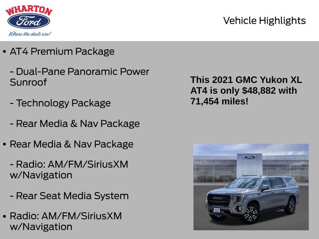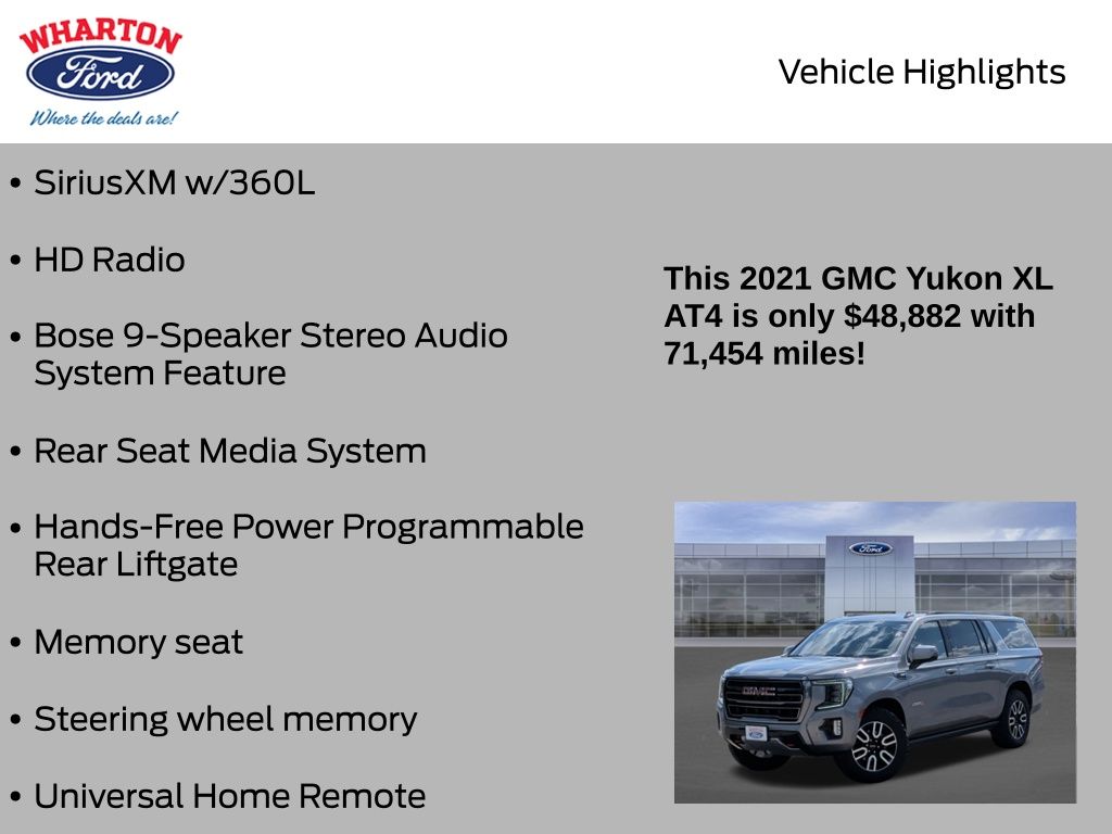 Satin Steel Metallic 2021 GMC Yukon XL AT4 4WD 10-Speed Automatic with Overdrive EcoTec3 5.3L V8 1 OWNER, REAR 12.6" LED MEDIA, 4WD, 12-Way Power Seat Adjusters, 15" Diagonal Multi-Color Head-Up Display, 2 Presets For Outside Rearview Mirrors, 3rd Row 60/40 Power-Folding Split-Bench Seat, Adaptive suspension, Alloy wheels, AT4 Premium Package, Black Roof-Mounted Luggage Rack Side Rails, Bose 9-Speaker Stereo Audio System Feature, Bright Front & Rear Door Sill Plates, Dual-Pane Panoramic Power Su