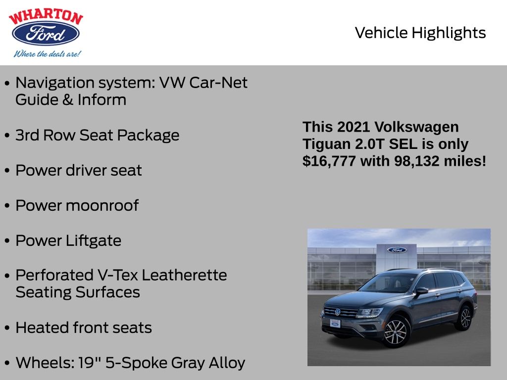 Platinum Gray Metallic 2021 Volkswagen Tiguan 2.0T SEL AWD 8-Speed Automatic with Tiptronic 2.0L TSI DOHC AWD, 3rd Row Seat Package, Alloy wheels, Heated front seats, Navigation system: VW Car-Net Guide & Inform, Perforated V-Tex Leatherette Seating Surfaces, Power driver seat, Power Liftgate, Power moonroof, Wheels: 19" 5-Spoke Gray Alloy.