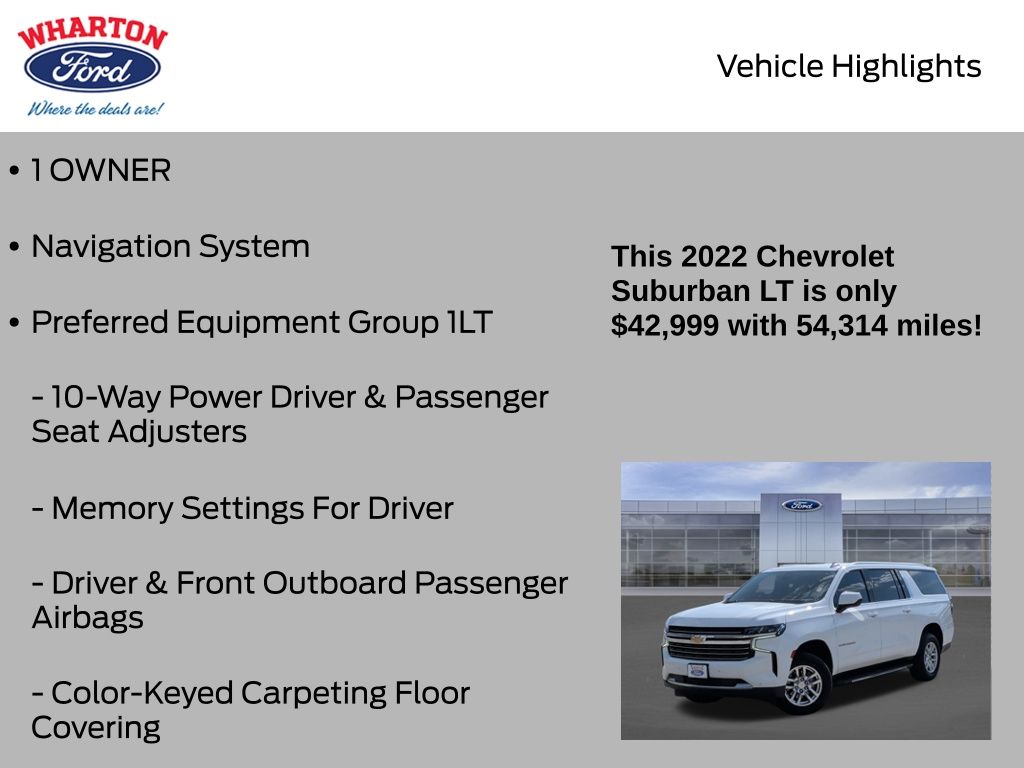 Summit White 2022 Chevrolet Suburban LT RWD 10-Speed Automatic with Overdrive EcoTec3 5.3L V8 1 OWNER, 10-Way Power Driver & Passenger Seat Adjusters, 1st & 2nd Row Color-Keyed Carpeted Floor Mats, Alloy wheels, Auto-Dimming Inside Rear-View Mirror, Automatic Stop/Start, Bose 9-Speaker Stereo Audio System Feature, Bright Front & Rear Door Sill Plates, Color-Keyed Carpeting Floor Covering, Driver & Front Outboard Passenger Airbags, Enhanced Driver Information Center, Floor Console w/Storage Area,