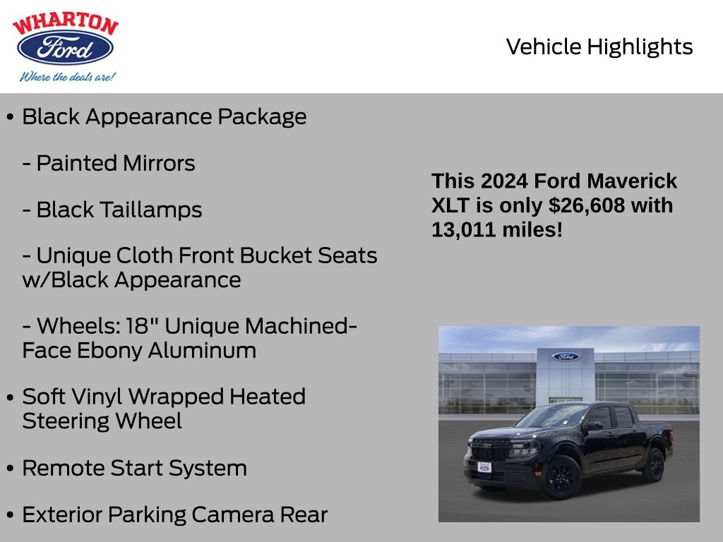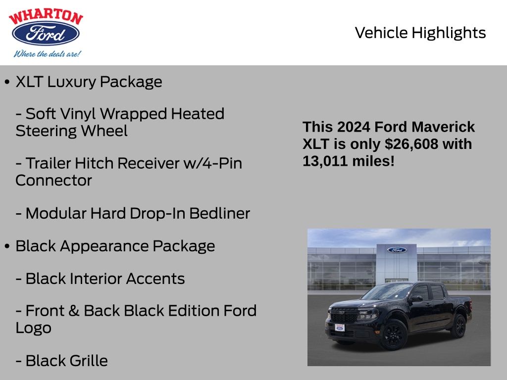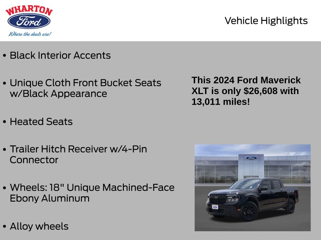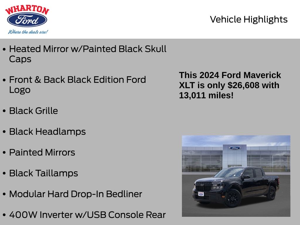Certified. Shadow Black 2024 Ford Maverick XLT FWD 8-Speed Automatic EcoBoost 2.0L I4 GTDi DOHC Turbocharged VCT 1 OWNER, 400W Inverter w/USB Console Rear, Alloy wheels, Black Appearance Package, Black Grille, Black Headlamps, Black Interior Accents, Black Taillamps, Equipment Group 300A Standard, Exterior Parking Camera Rear, Front & Back Black Edition Ford Logo, Heated Mirror w/Painted Black Skull Caps, Heated Seats, LED Box Lighting, Modular Hard Drop-In Bedliner, Painted Mirrors, Remote Star