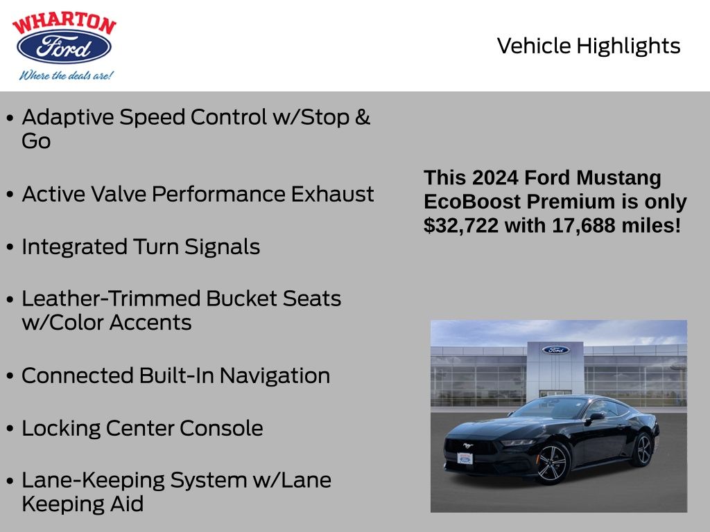 Certified. Shadow Black 2024 Ford Mustang EcoBoost Premium RWD 10-Speed Automatic EcoBoost 2.3L I4 GTDi DOHC Turbocharged VCT Active Anti-Theft System, Active Valve Performance Exhaust, Adaptive Speed Control w/Stop & Go, Alloy wheels, B&O Sound System by Bang & Olufsen, Connected Built-In Navigation, Equipment Group 201A High Package, Ford Co-Pilot360 Assist+, Illuminated Door-Sill Scuff Plates, Integrated Turn Signals, Lane-Keeping System w/Lane Keeping Aid, Leather-Trimmed Bucket Seats w/Colo