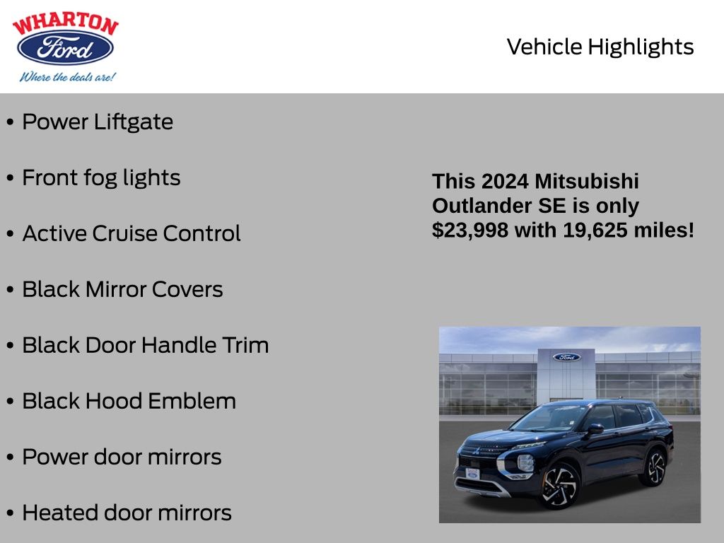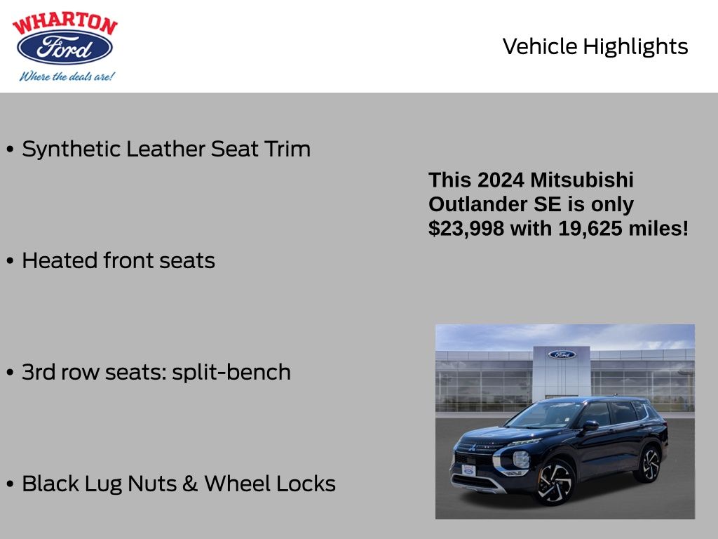 Cosmic Blue Metallic 2024 Mitsubishi Outlander SE FWD CVT 2.5L 4-Cylinder DOHC 3rd row seats: split-bench, Active Cruise Control, Black Door Handle Trim, Black Hood Emblem, Black Lug Nuts & Wheel Locks, Black Mirror Covers, Black Out Appearance Package, Front fog lights, Heated door mirrors, Heated front seats, Navigation System, Power door mirrors, Power driver seat, Power Liftgate, Radio: AM/FM 9.0" Navigation w/Smartphone Link, Synthetic Leather Seat Trim.
