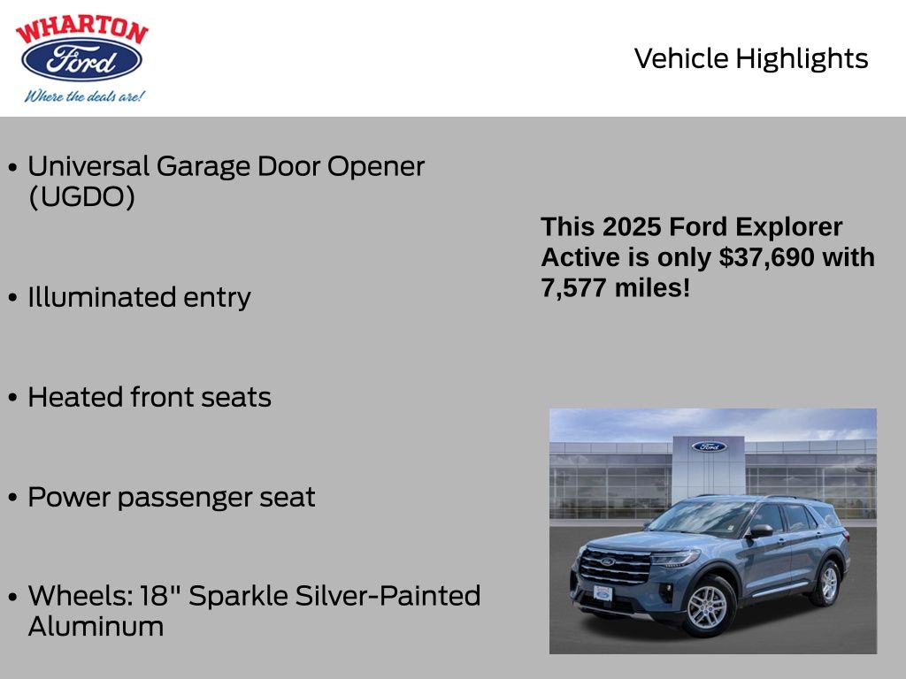 Certified. Vapor Blue 2025 Ford Explorer Active RWD 10-Speed Automatic 2.3L EcoBoost I-4 2nd Row Capt, Active Comfort Package, Equipment Group 200A Standard Package, Exterior Parking Camera Rear, Front Fascia, Heated ActiveX Seating Material Captain's Chairs, Heated front seats, Heated Steering Wheel, Illuminated entry, Navigation System, Power passenger seat, Remote Start System, Second Row HVAC Controls, Universal Garage Door Opener (UGDO), Wheels: 18" Sparkle Silver-Painted Aluminum.