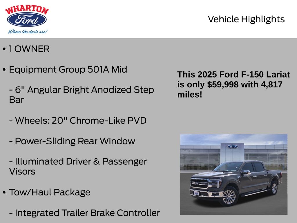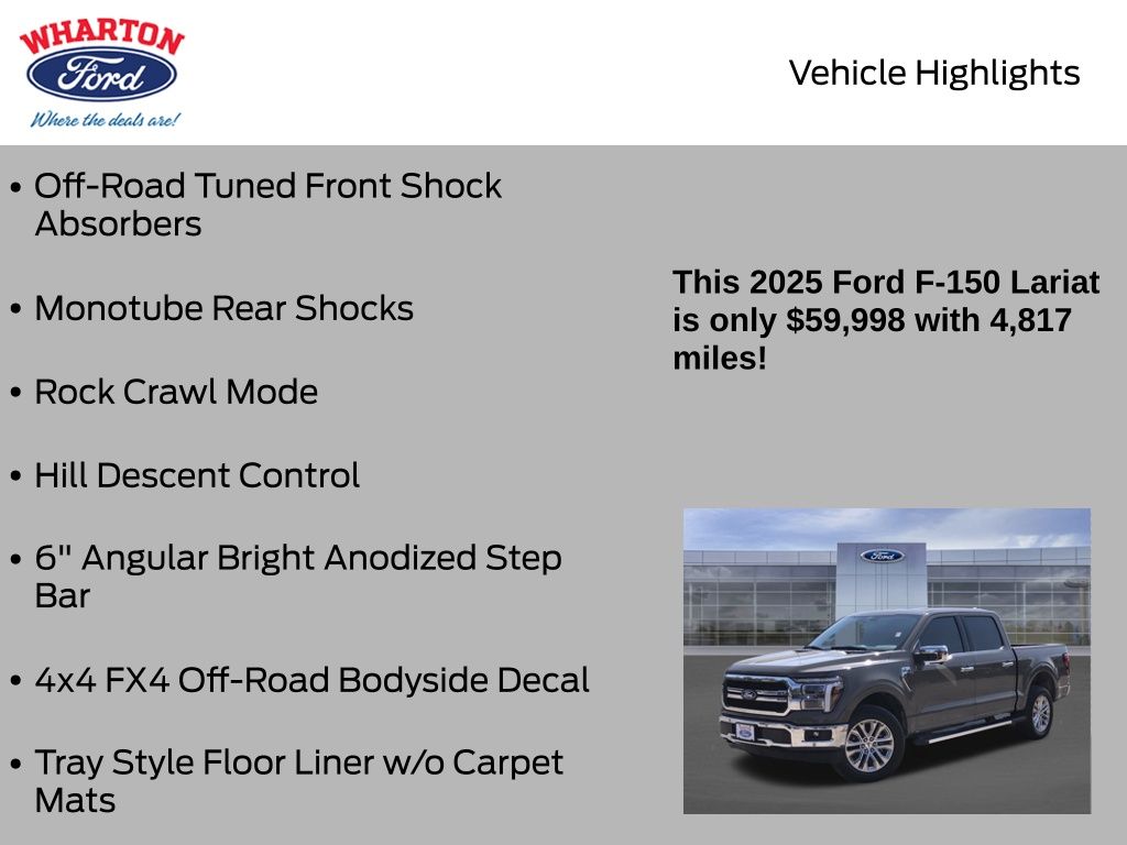 Certified. Marsh Gray 2025 Ford F-150 Lariat 4WD 10-Speed Automatic 5.0L V8 1 OWNER, 4WD, 4x4 FX4 Off-Road Bodyside Decal, 6" Angular Bright Anodized Step Bar, Electronic Locking w/3.31 Axle Ratio, Equipment Group 501A Mid, FX4 Off-Road Package, Hill Descent Control, Illuminated Driver & Passenger Visors, Integrated Trailer Brake Controller, Monotube Rear Shocks, Off-Road Tuned Front Shock Absorbers, Power-Sliding Rear Window, Rock Crawl Mode, Tow/Haul Package, Tray Style Floor Liner w/o Carpet